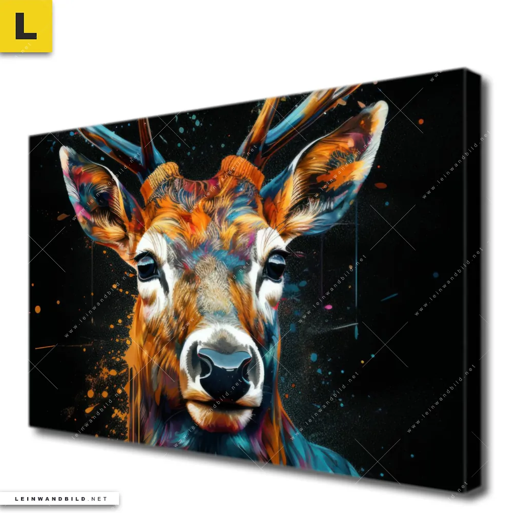 Du bist auf der Suche nach einem XXL Tierwelt Leinwandbild und Begriffe wie Hirsch, Natur, Rotwild, Wald, Farbspritzer, Farbexplosion haben Dich auf der Suche nach Deinem neuen Querformat Wandbild auf Leinwand inspiriert? Farben wie Schwarz, Bunt dürfen auf Deinem neuen breiten Keilrahmenbild nicht fehlen und Leinwände im Modern Art, Pop Art, Abstrakt Stil passen perfekt zu Deinem Einrichtungsstil?
