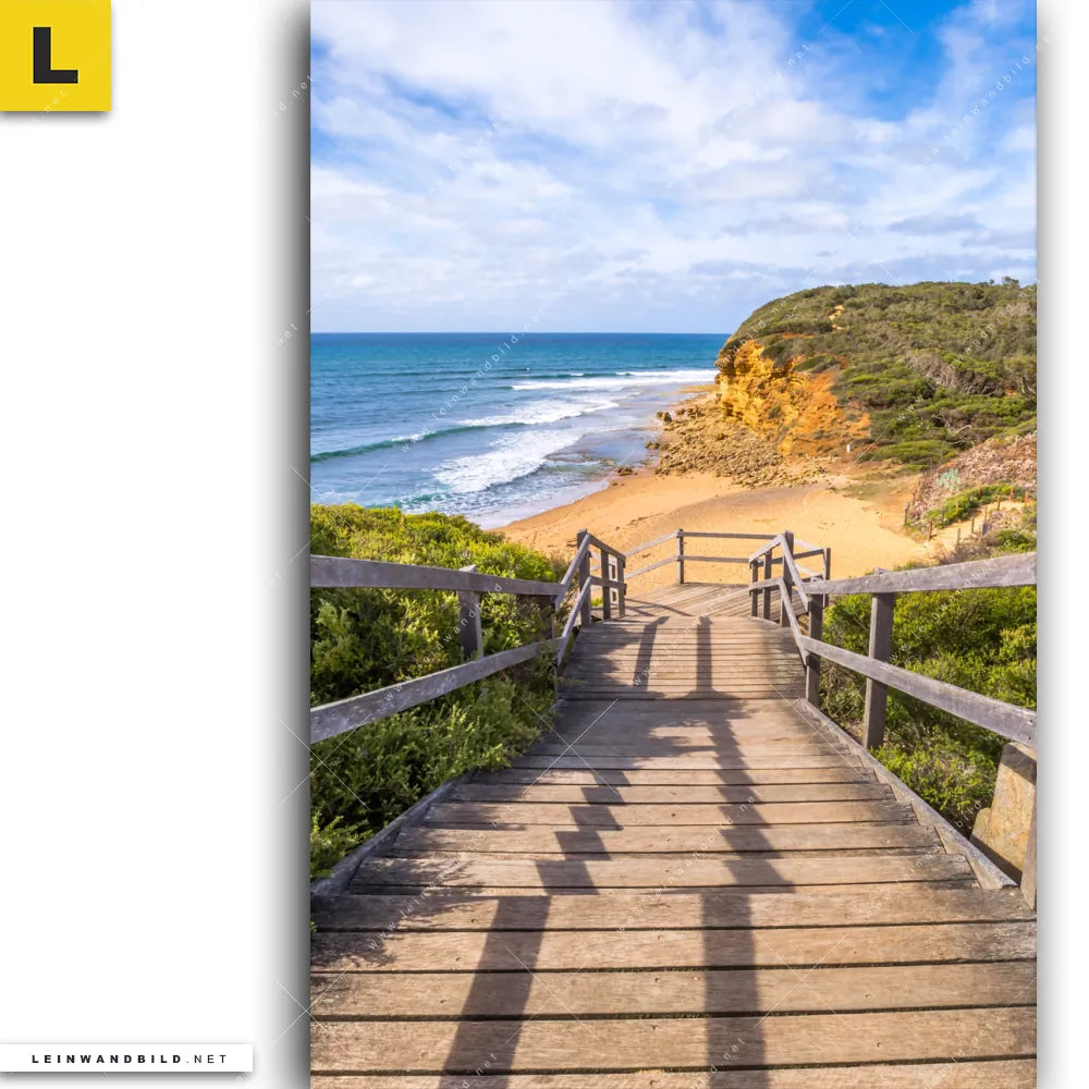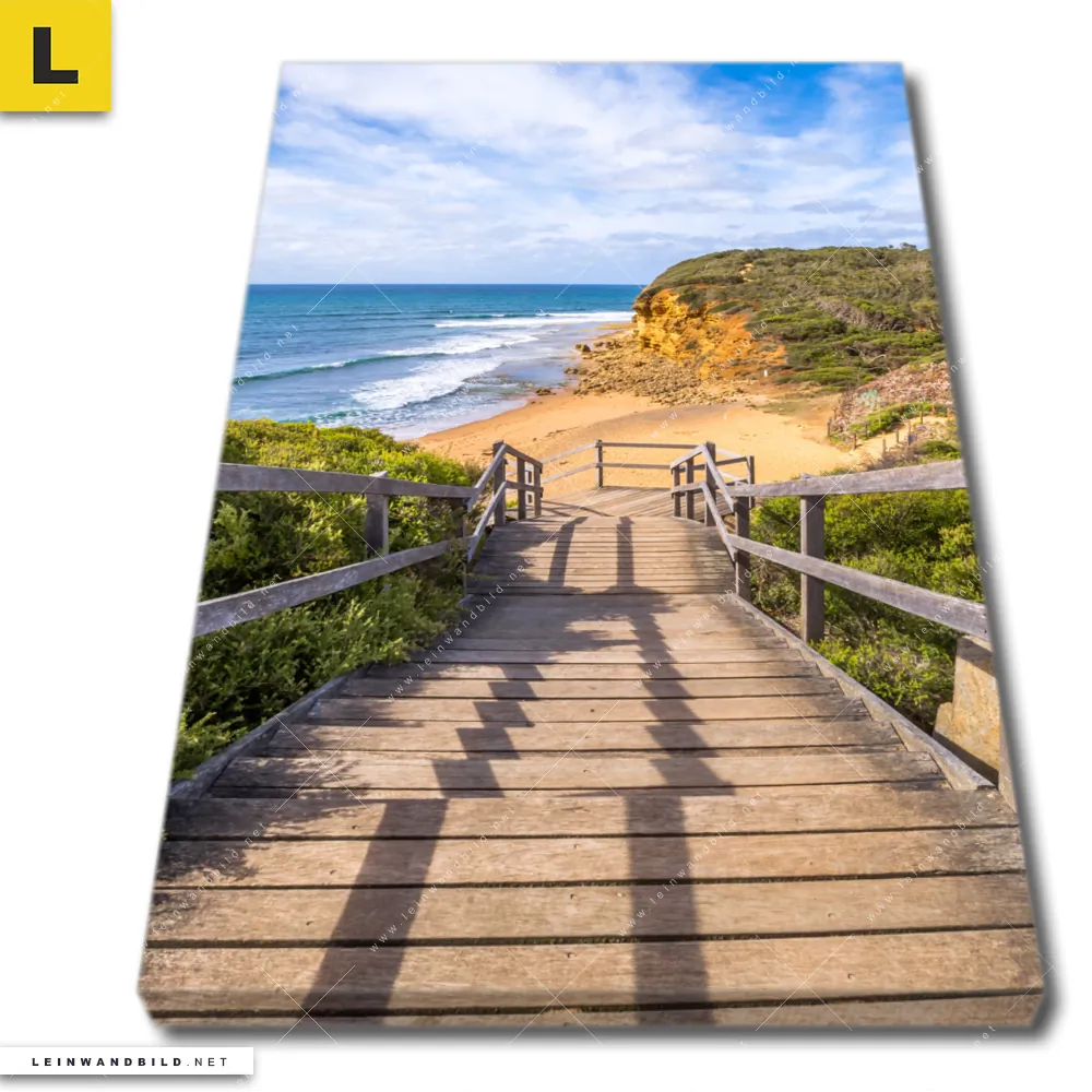 Dann sollte das Leinwandbild | Holztreppe zum einsamen Strand | Hochformat den Weg zu Dir finden. Die moderne Fotoleinwand Einsamer Strand wartet unten fügt sich als Eye-Catcher harmonisch in jedes Wohnzimmer - Schlafzimmer, Büro - Kanzlei, Arzt - Praxis Raumkonzept ein.
