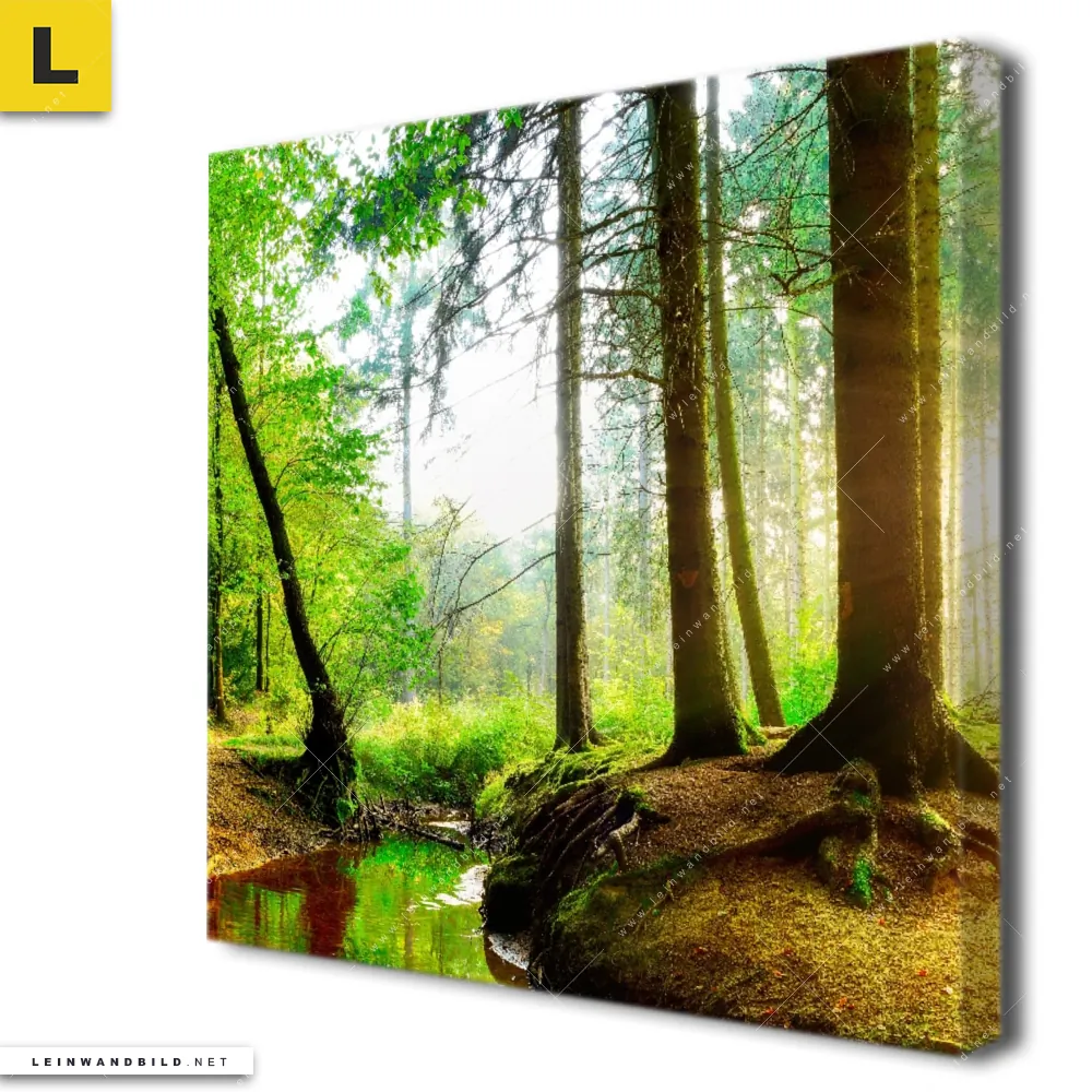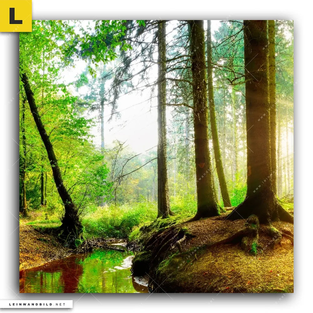 Leinwandbild | Idyllischer Wald bei Sonnenaufgang | Quadrat