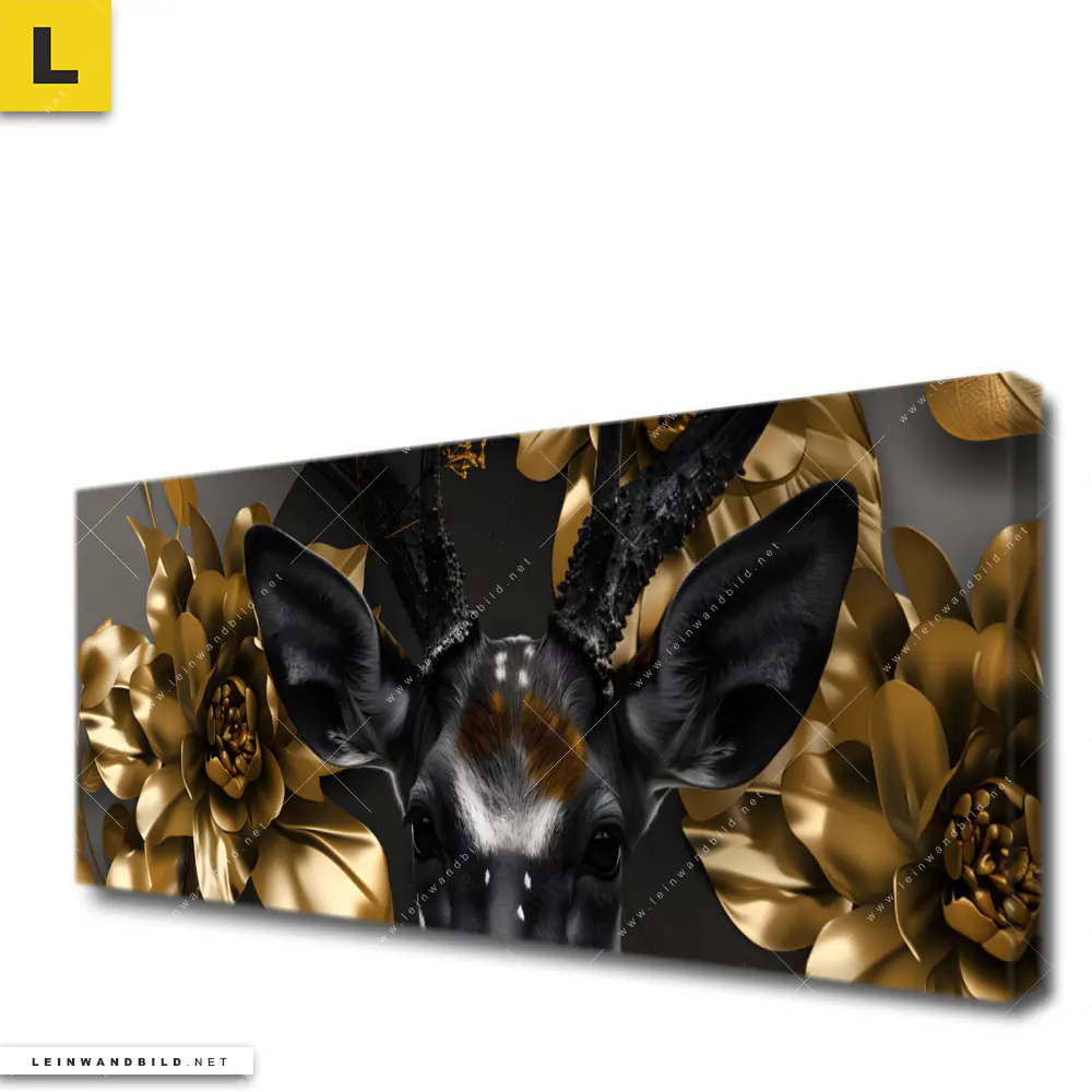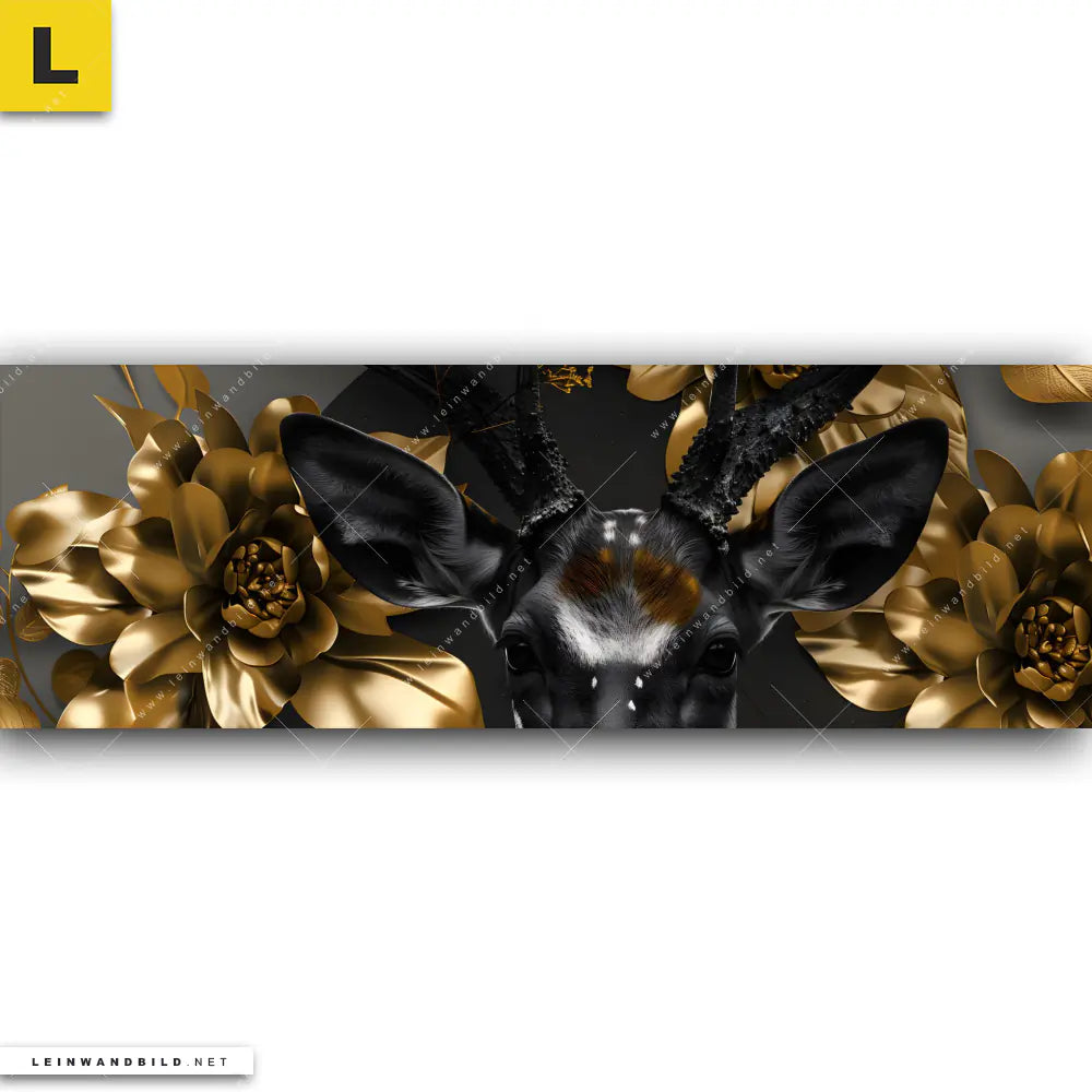 Du konfigurierst Dein individuelles Leinwandbild | Junger Hirsch und Goldblumen | Panorama und wir produzieren es NEU für Dich. Unsere Tierwelt, Blumen - Botanik Leinwände sind KEINE Lagerware. Du bist Dir unsicher, welches Motiv oder Format das richtige für dein individuelles Keilrahmenbild ist, dann helfen wir dir gerne weiter und beraten dich!