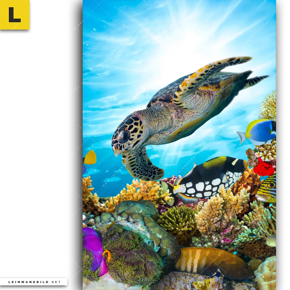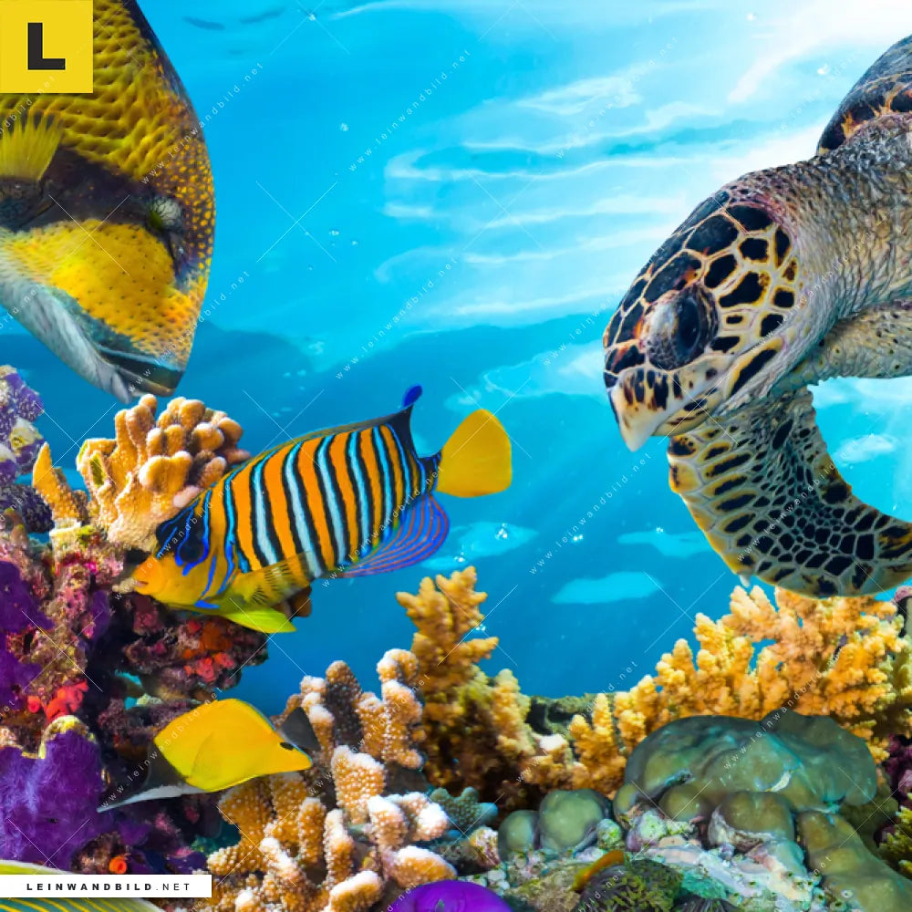 Bitte beachte, dass die Farben, der auf dem Monitor abgebildeten Korallen mit Schildkröte und Fischen Darstellung, möglicherweise von den Originalfarben abweichen können.