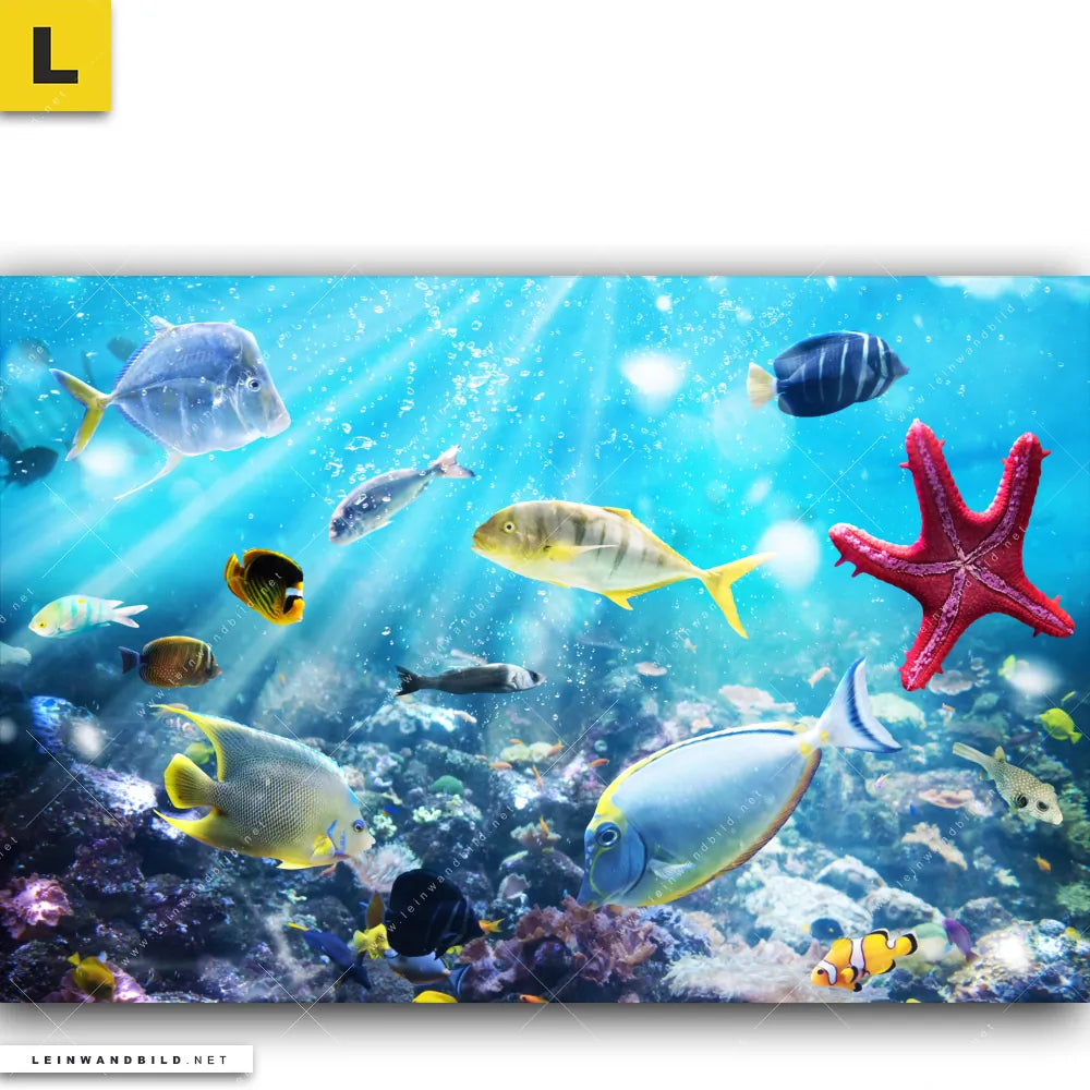 Dann sollte das Leinwandbild | Korallenriff im Ozean | Querformat den Weg zu Dir finden. Die moderne Fotoleinwand Exotische Fische auf Korallenbank fügt sich als Eye-Catcher harmonisch in jedes Arzt - Praxis, Wohnzimmer - Schlafzimmer, Badezimmer, Bar - Gastronomie, Büro - Kanzlei, Kinderzimmer Raumkonzept ein.