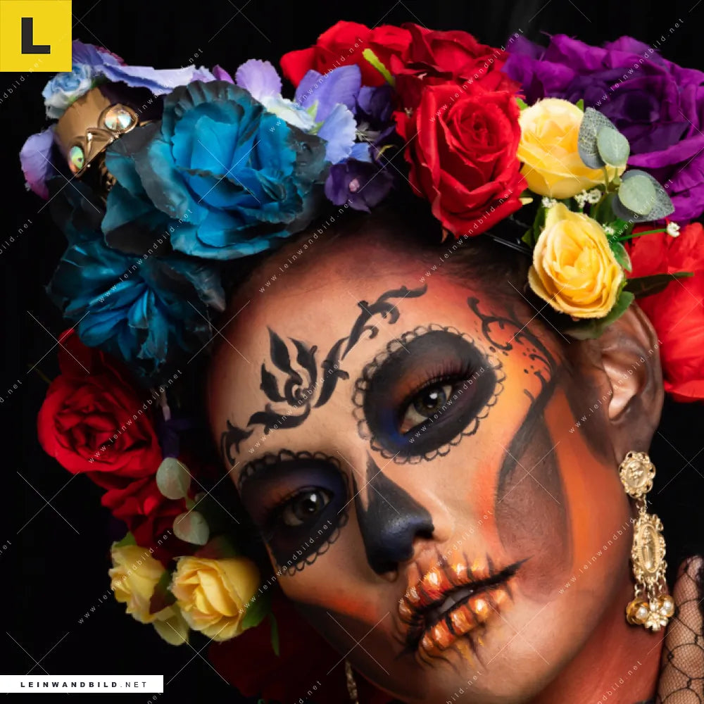 Du bist auf der Suche nach einem XXL Porträts - Menschen Leinwandbild und Begriffe wie Frau, Porträt, modern, Beauty, Gesicht, Körper, Make-up, Totenkopf, Schädel, Halloween, Tag der Toten, Santa Muerte, Blumen haben Dich auf der Suche nach Deinem neuen Schmalen Wandbild auf Leinwand inspiriert? Farben wie Schwarz, Weiss, Orange dürfen auf Deinem neuen Keilrahmenbild im Panorama-Hochformat nicht fehlen und Leinwände im Modern Art, Schwarz - Weiss Stil passen perfekt zu Deinem Einrichtungsstil?