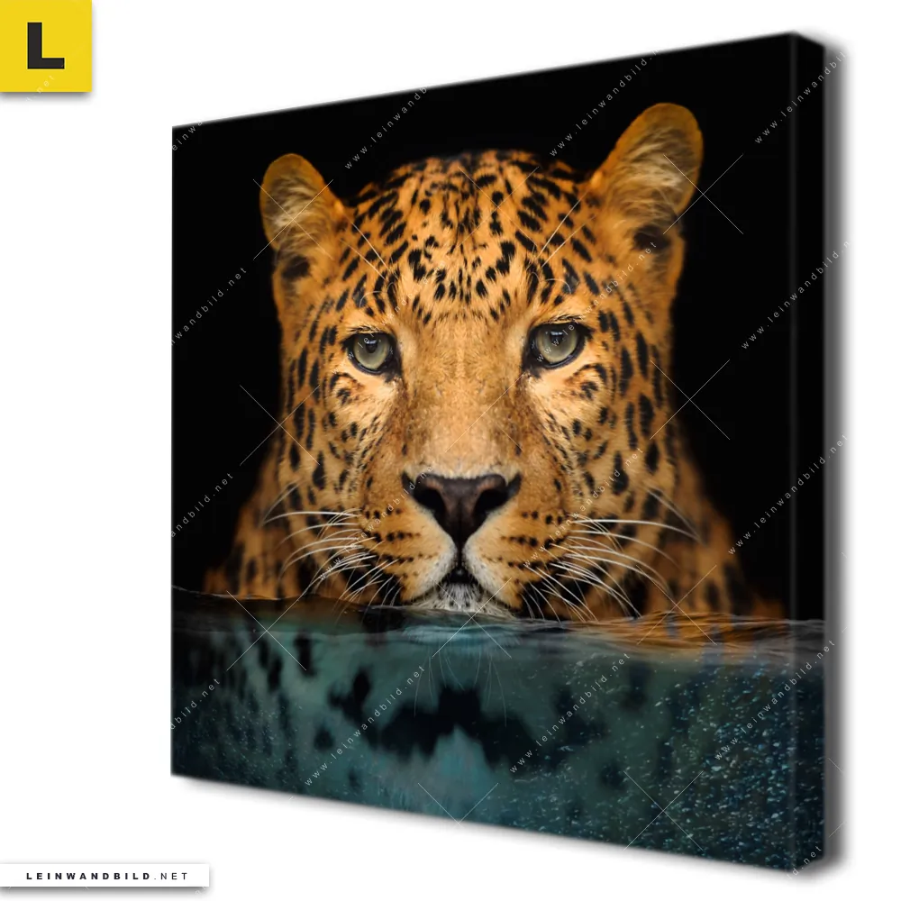 Du konfigurierst Dein individuelles Leinwandbild | Leopard im Wasser | Quadrat und wir produzieren es NEU für Dich. Unsere Tierwelt Leinwände sind KEINE Lagerware. Du bist Dir unsicher, welches Motiv oder Format das richtige für dein individuelles Keilrahmenbild ist, dann helfen wir dir gerne weiter und beraten dich!