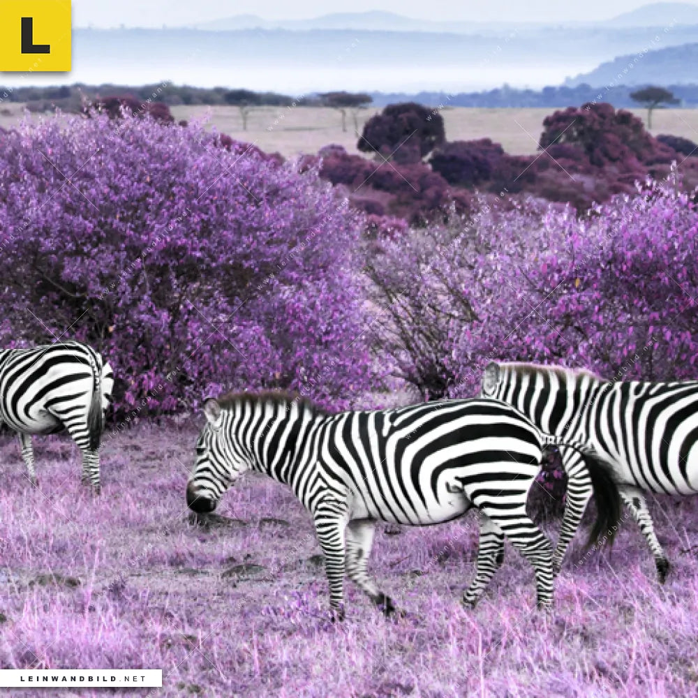Bitte beachte, dass die Farben, der auf dem Monitor abgebildeten Zebras inmitten lilafarbener Gräser und Büsche Darstellung, möglicherweise von den Originalfarben abweichen können.