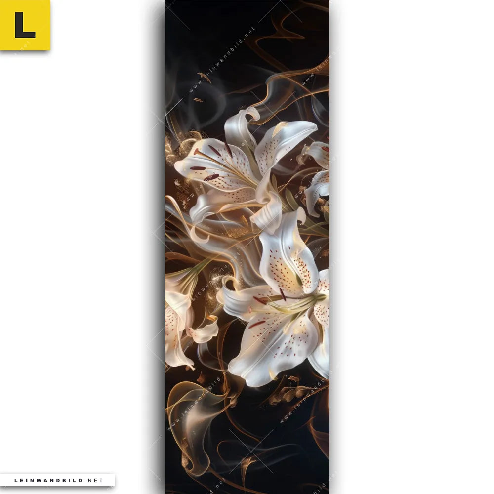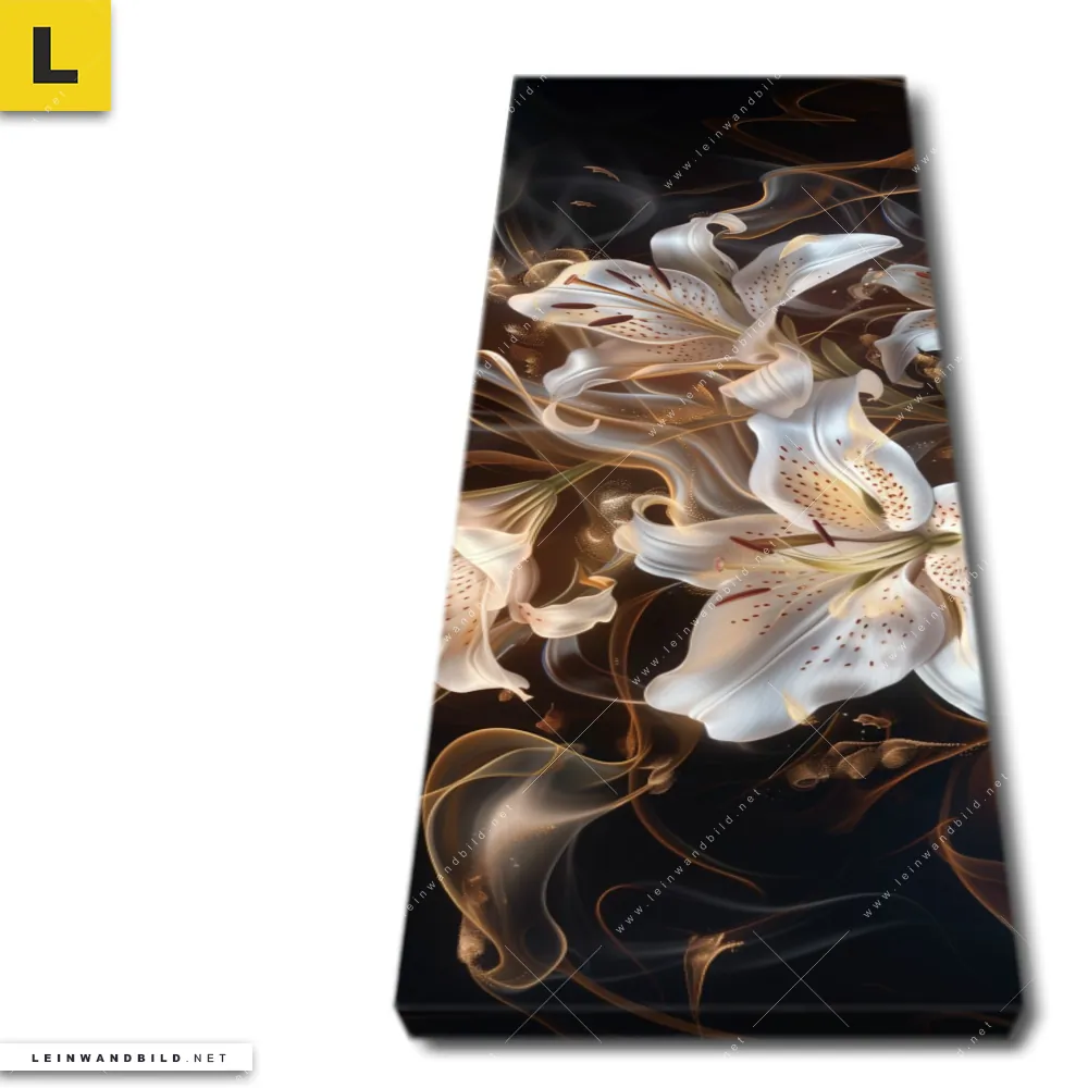Du konfigurierst Dein individuelles Leinwandbild | Lilien in goldenem Rauch | Schmal und wir produzieren es NEU für Dich. Unsere Blumen - Botanik Leinwände sind KEINE Lagerware. Du bist Dir unsicher, welches Motiv oder Format das richtige für dein individuelles Keilrahmenbild ist, dann helfen wir dir gerne weiter und beraten dich!