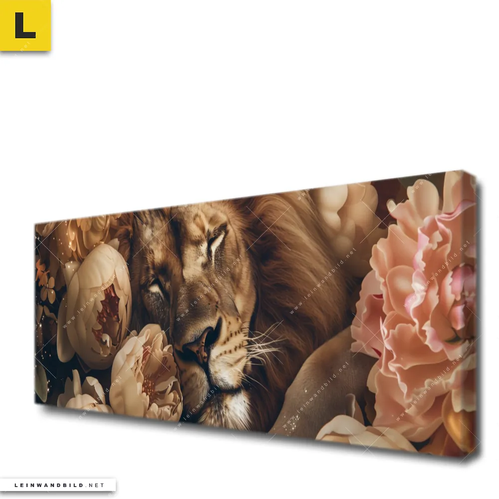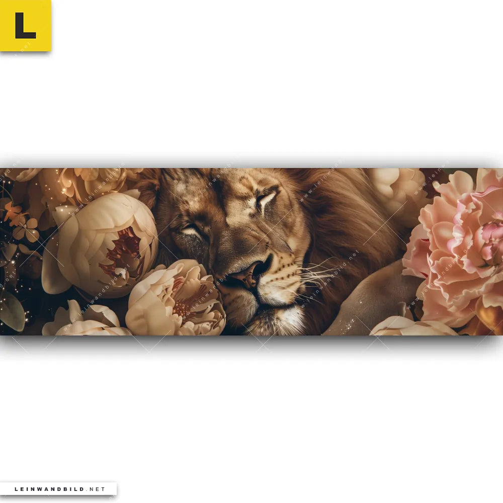 Leinwandbild | Löwe schläft in Blüten | Panorama