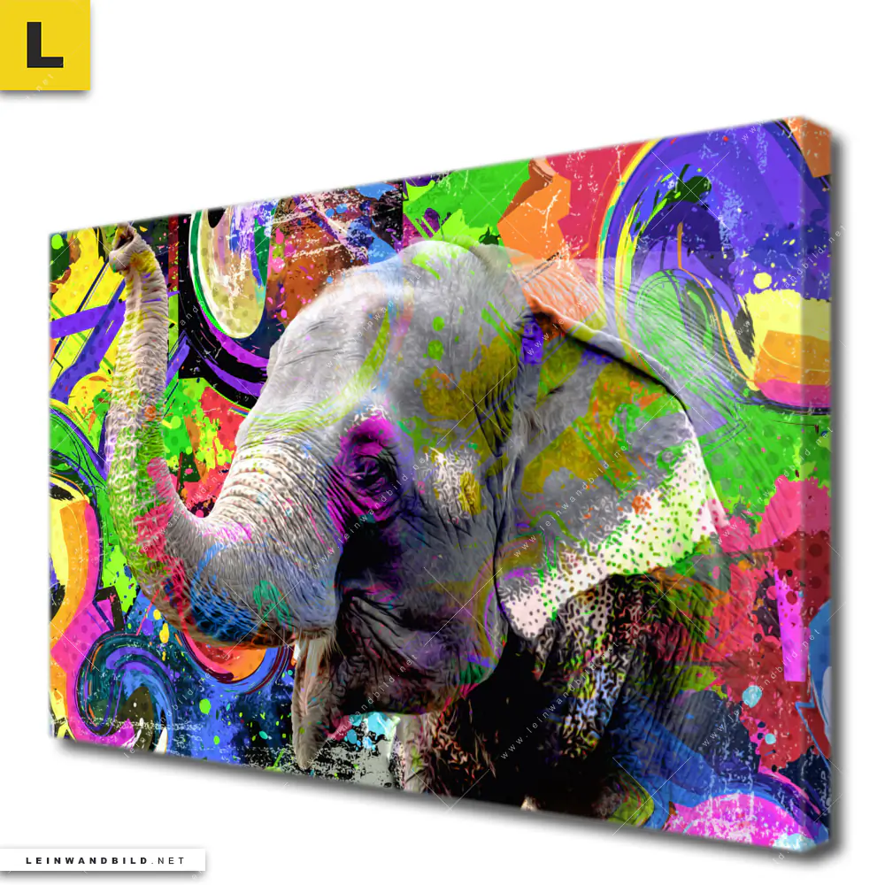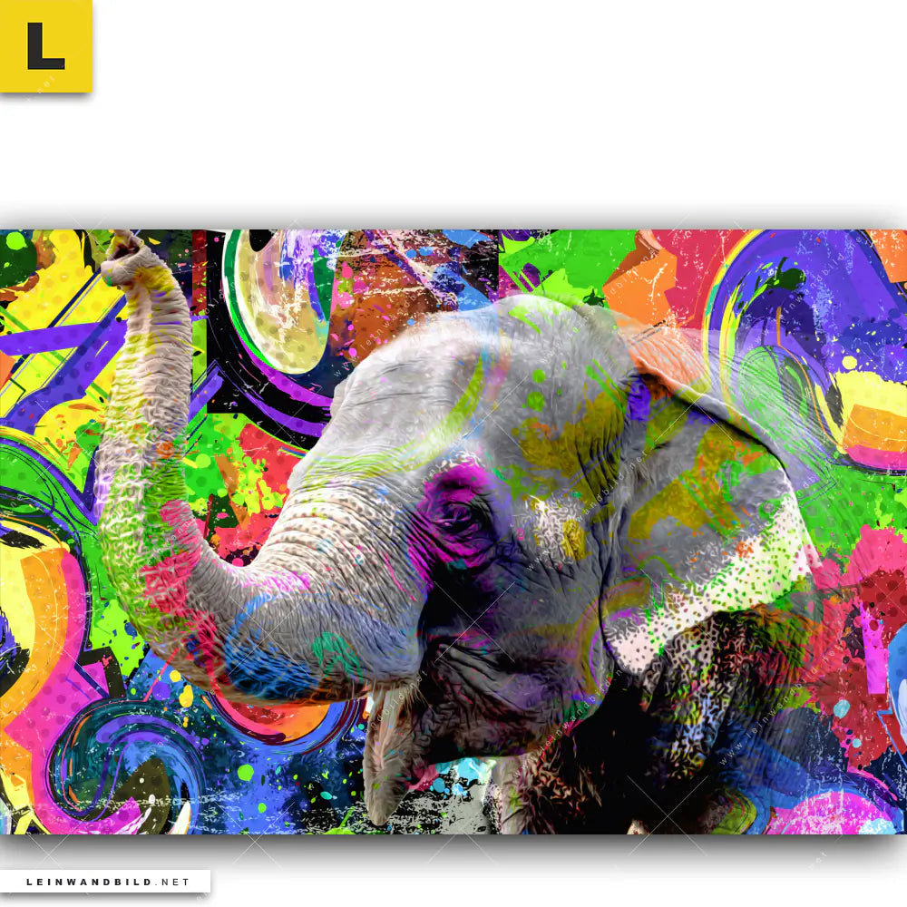 Dann sollte das Leinwandbild | Moderner bunter Elefant No. 2 | Querformat den Weg zu Dir finden. Die moderne Fotoleinwand Bunter Elefant fügt sich als Eye-Catcher harmonisch in jedes Wohnzimmer - Schlafzimmer, Bar - Gastronomie, Flur - Eingangsbereich, Kinderzimmer Raumkonzept ein.