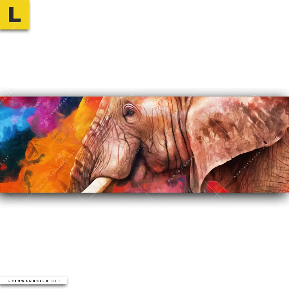 Du konfigurierst Dein individuelles Leinwandbild | Moderner Bunter Elefant | Panorama und wir produzieren es NEU für Dich. Unsere Tierwelt Leinwände sind KEINE Lagerware. Du bist Dir unsicher, welches Motiv oder Format das richtige für dein individuelles Keilrahmenbild ist, dann helfen wir dir gerne weiter und beraten dich!