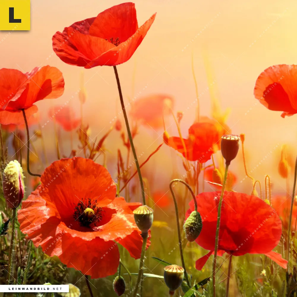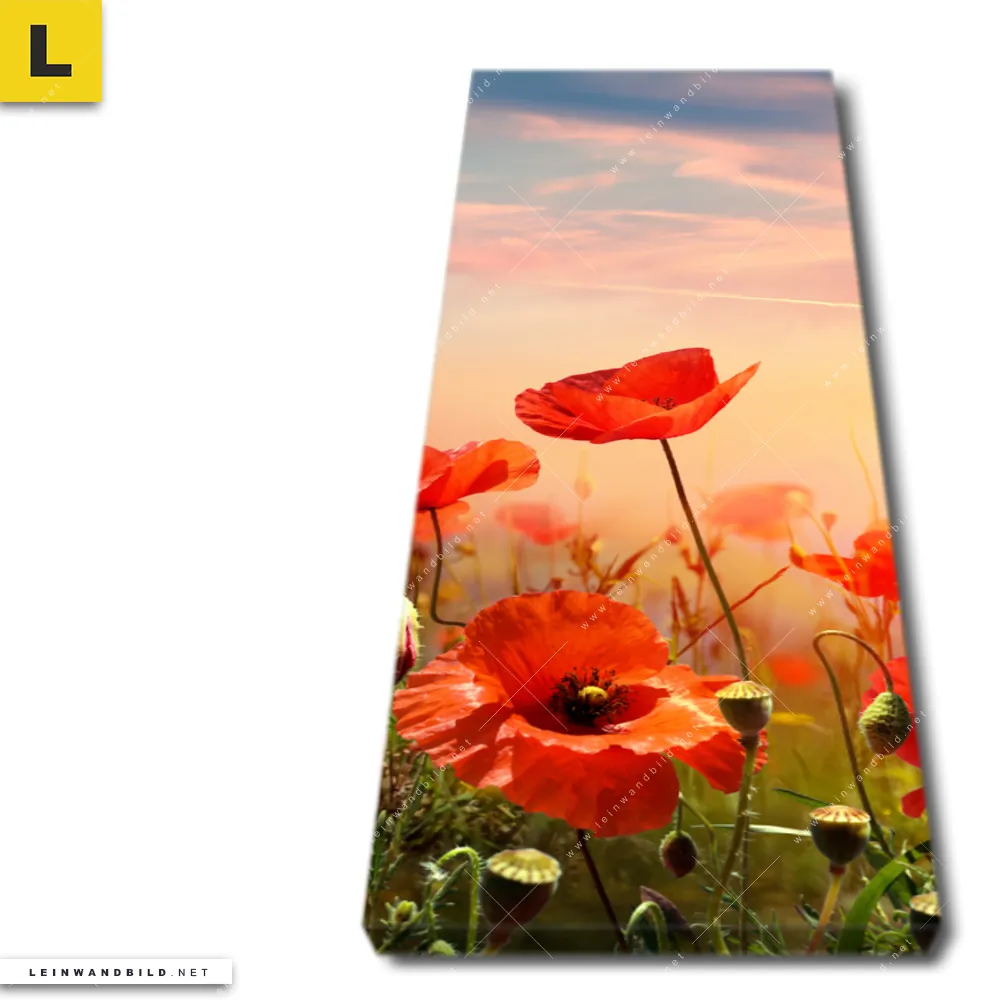 Du konfigurierst Dein individuelles Leinwandbild | Mohnblumenfeld bei Sonnenuntergang | Schmal und wir produzieren es NEU für Dich. Unsere Landschaften, Blumen - Botanik Leinwände sind KEINE Lagerware. Du bist Dir unsicher, welches Motiv oder Format das richtige für dein individuelles Keilrahmenbild ist, dann helfen wir dir gerne weiter und beraten dich!