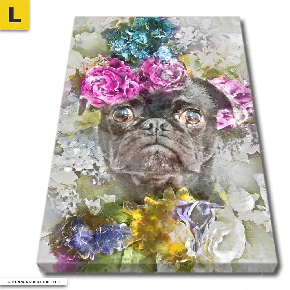 Du konfigurierst Dein individuelles Leinwandbild | Mops & Blumen | Hochformat und wir produzieren es NEU für Dich. Unsere Tierwelt, Blumen - Botanik Leinwände sind KEINE Lagerware. Du bist Dir unsicher, welches Motiv oder Format das richtige für dein individuelles Keilrahmenbild ist, dann helfen wir dir gerne weiter und beraten dich!