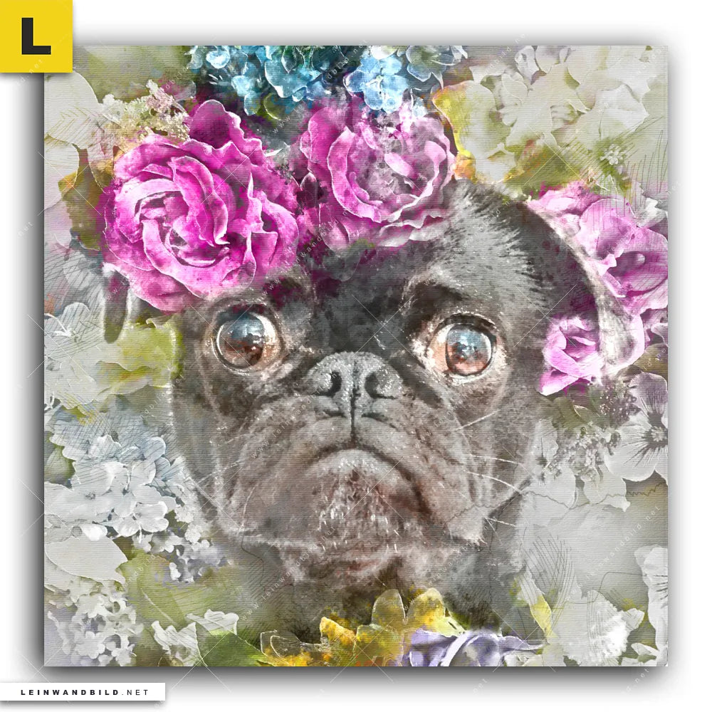 Bitte beachte, dass die Farben, der auf dem Monitor abgebildeten Porträt eines Mopses mit Blumenkranz Darstellung, möglicherweise von den Originalfarben abweichen können.