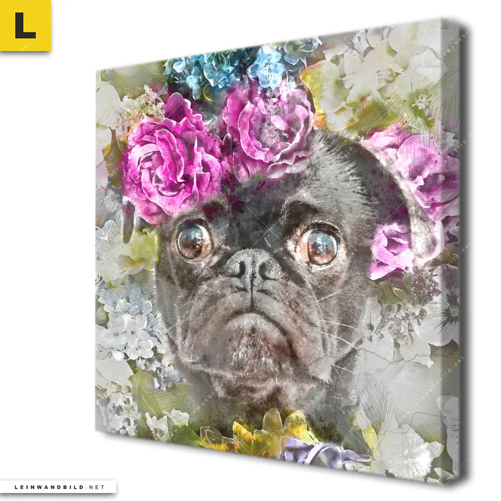 Du konfigurierst Dein individuelles Leinwandbild | Mops & Blumen | Quadrat und wir produzieren es NEU für Dich. Unsere Tierwelt, Blumen - Botanik Leinwände sind KEINE Lagerware. Du bist Dir unsicher, welches Motiv oder Format das richtige für dein individuelles Keilrahmenbild ist, dann helfen wir dir gerne weiter und beraten dich!