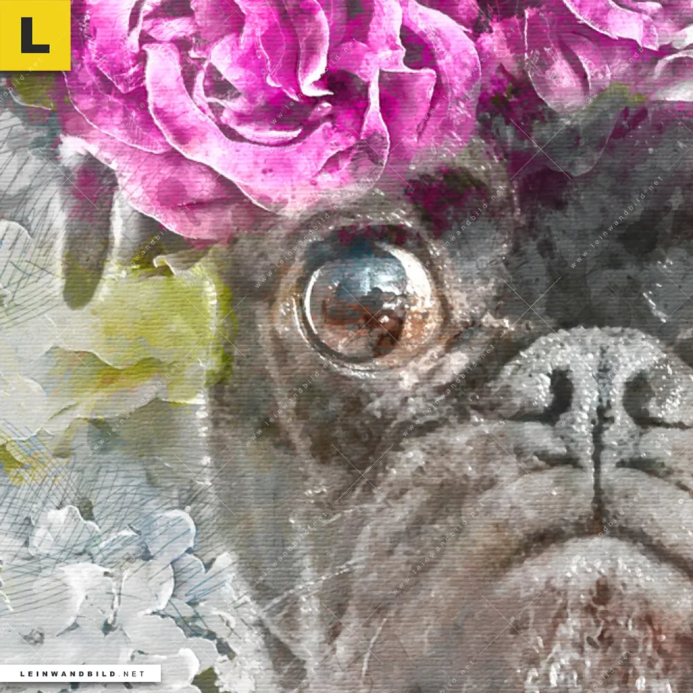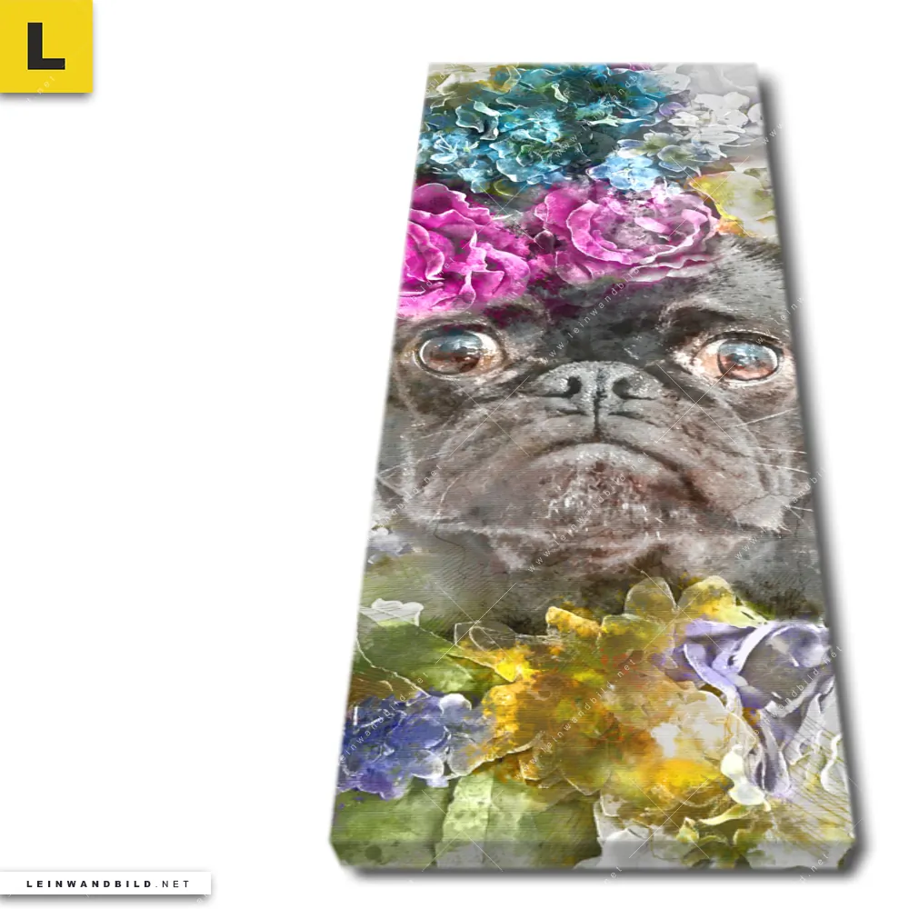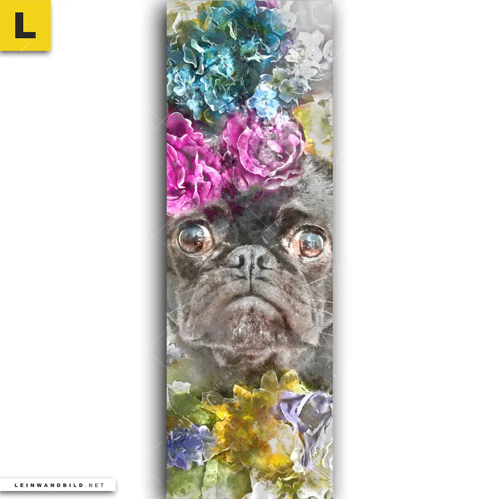 Du konfigurierst Dein individuelles Leinwandbild | Mops & Blumen | Schmal und wir produzieren es NEU für Dich. Unsere Tierwelt, Blumen - Botanik Leinwände sind KEINE Lagerware. Du bist Dir unsicher, welches Motiv oder Format das richtige für dein individuelles Keilrahmenbild ist, dann helfen wir dir gerne weiter und beraten dich!