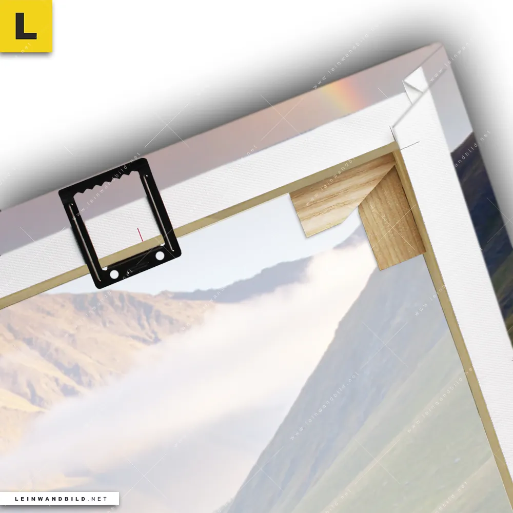 Du konfigurierst Dein individuelles Leinwandbild | Nebel und Regenbogen zwischen den Bergen | Panorama und wir produzieren es NEU für Dich. Unsere Landschaften Leinwände sind KEINE Lagerware. Du bist Dir unsicher, welches Motiv oder Format das richtige für dein individuelles Keilrahmenbild ist, dann helfen wir dir gerne weiter und beraten dich!