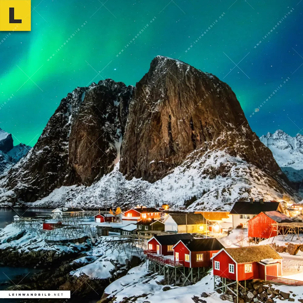 Dann sollte das Leinwandbild | Nordlichter | Quadrat den Weg zu Dir finden. Die moderne Fotoleinwand Nordlichter über skandinavischem Dorf fügt sich als Eye-Catcher harmonisch in jedes Arzt - Praxis, Büro - Kanzlei, Wohnzimmer - Schlafzimmer Raumkonzept ein.