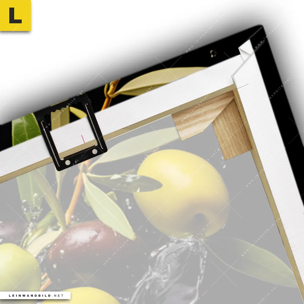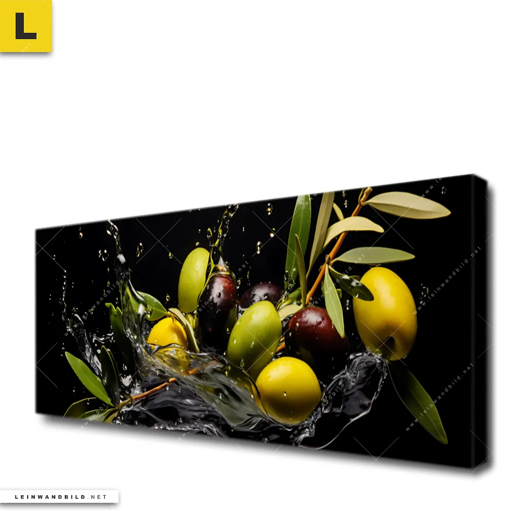 Du konfigurierst Dein individuelles Leinwandbild | Oliven Splash | Panorama und wir produzieren es NEU für Dich. Unsere Essen - Trinken Leinwände sind KEINE Lagerware. Du bist Dir unsicher, welches Motiv oder Format das richtige für dein individuelles Keilrahmenbild ist, dann helfen wir dir gerne weiter und beraten dich!