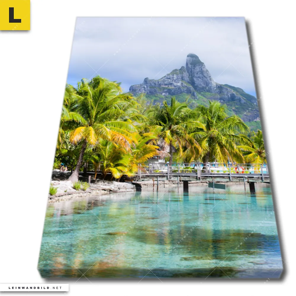 Begriffe wie Natur, Fluss, Palmen, Berg, Brücke, Steg, Asien, Sommer, Weg, Südsee - Karibik, Urlaub - Reisen haben Dich auf der Suche nach Deinem neuen Wandbild auf Leinwand inspiriert? Dann sollte das Leinwandbild Inselidylle mit Berg den Weg zu Dir finden.