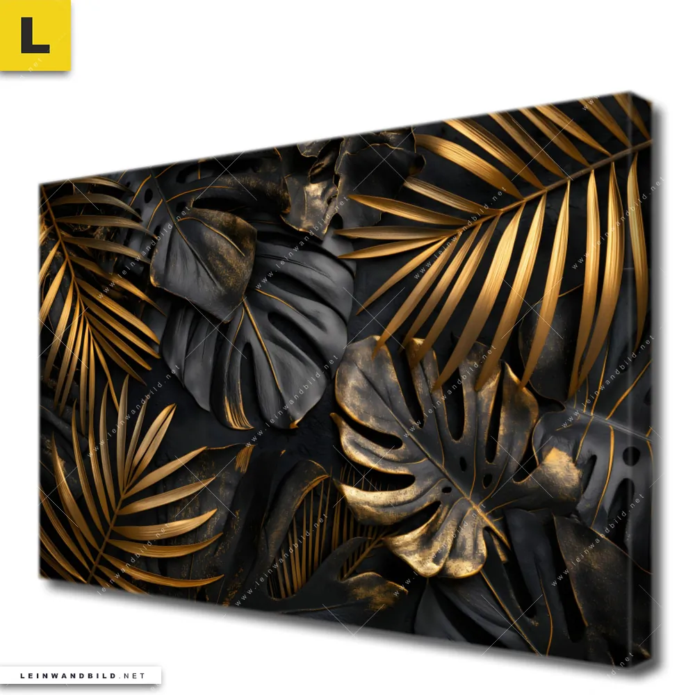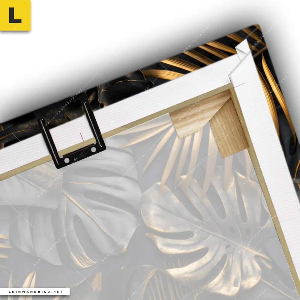 Du konfigurierst Dein individuelles Leinwandbild | Palmenblätter Schwarz Gold | Querformat und wir produzieren es NEU für Dich. Unsere Muster - Texturen, Blumen - Botanik Leinwände sind KEINE Lagerware. Du bist Dir unsicher, welches Motiv oder Format das richtige für dein individuelles Keilrahmenbild ist, dann helfen wir dir gerne weiter und beraten dich!