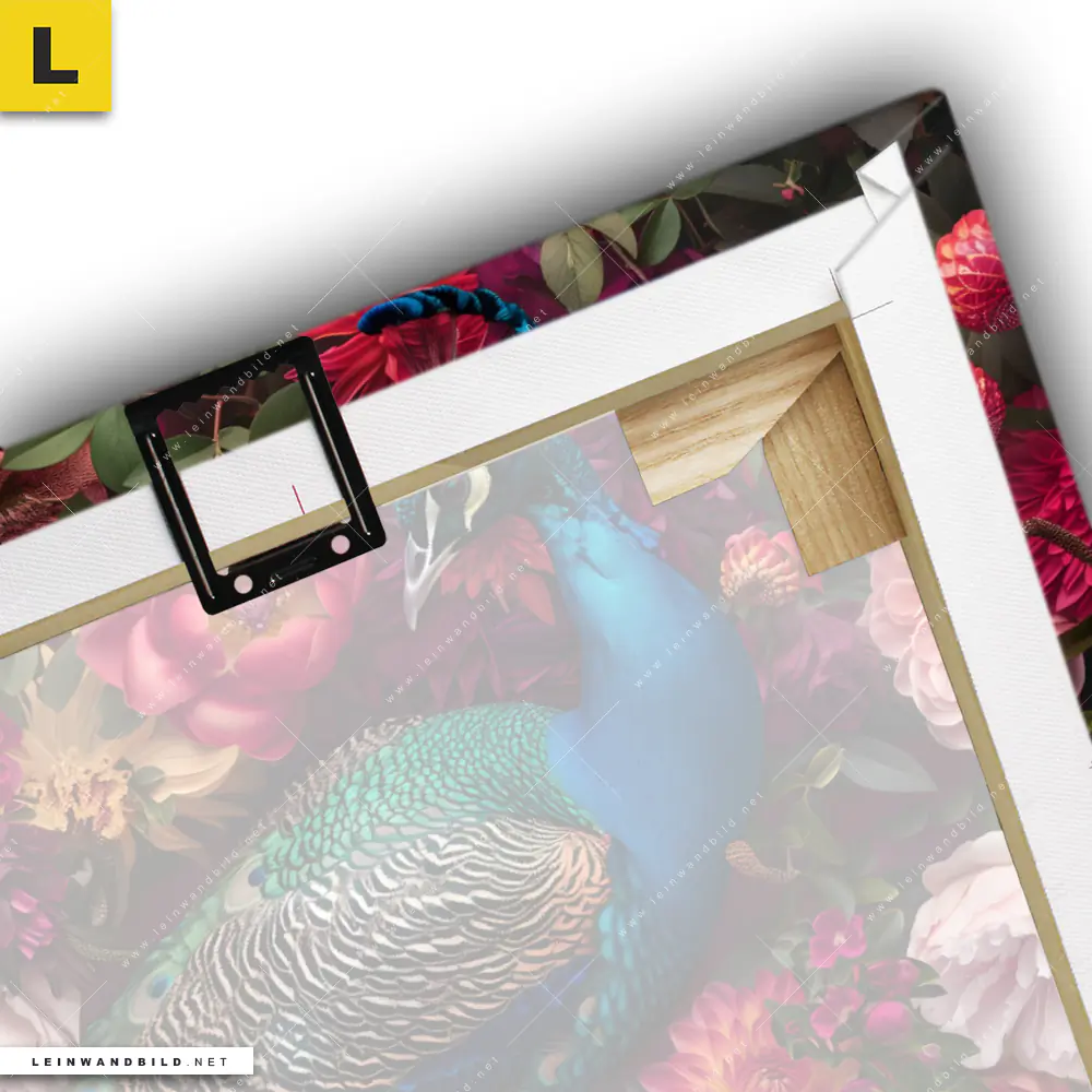 Du konfigurierst Dein individuelles Leinwandbild | Prachtvoller Pfau und Blüten | Querformat und wir produzieren es NEU für Dich. Unsere Tierwelt, Blumen - Botanik Leinwände sind KEINE Lagerware. Du bist Dir unsicher, welches Motiv oder Format das richtige für dein individuelles Keilrahmenbild ist, dann helfen wir dir gerne weiter und beraten dich!