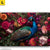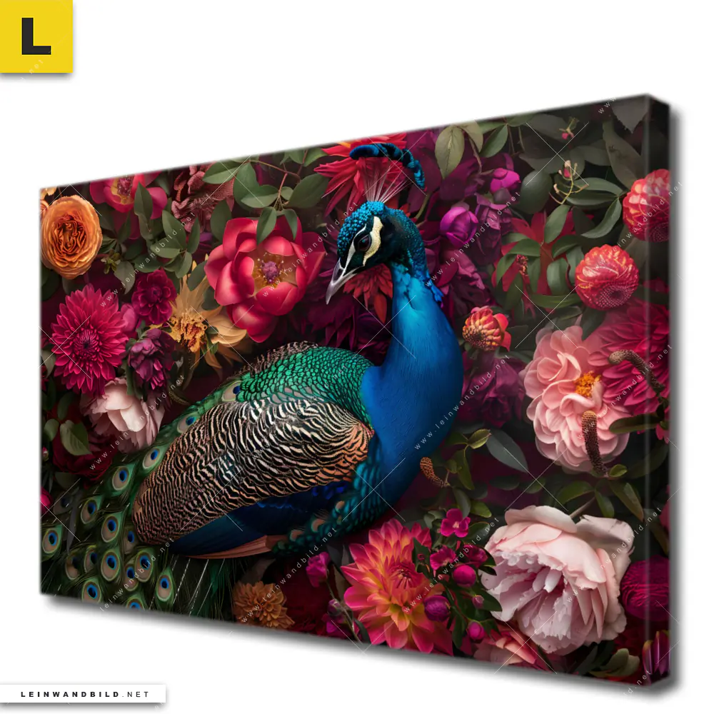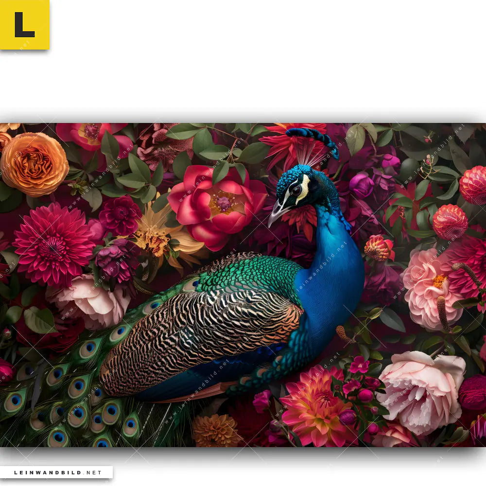 Leinwandbild | Prachtvoller Pfau und Blüten | Querformat