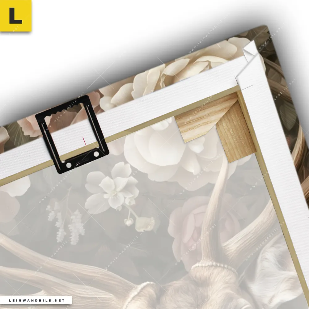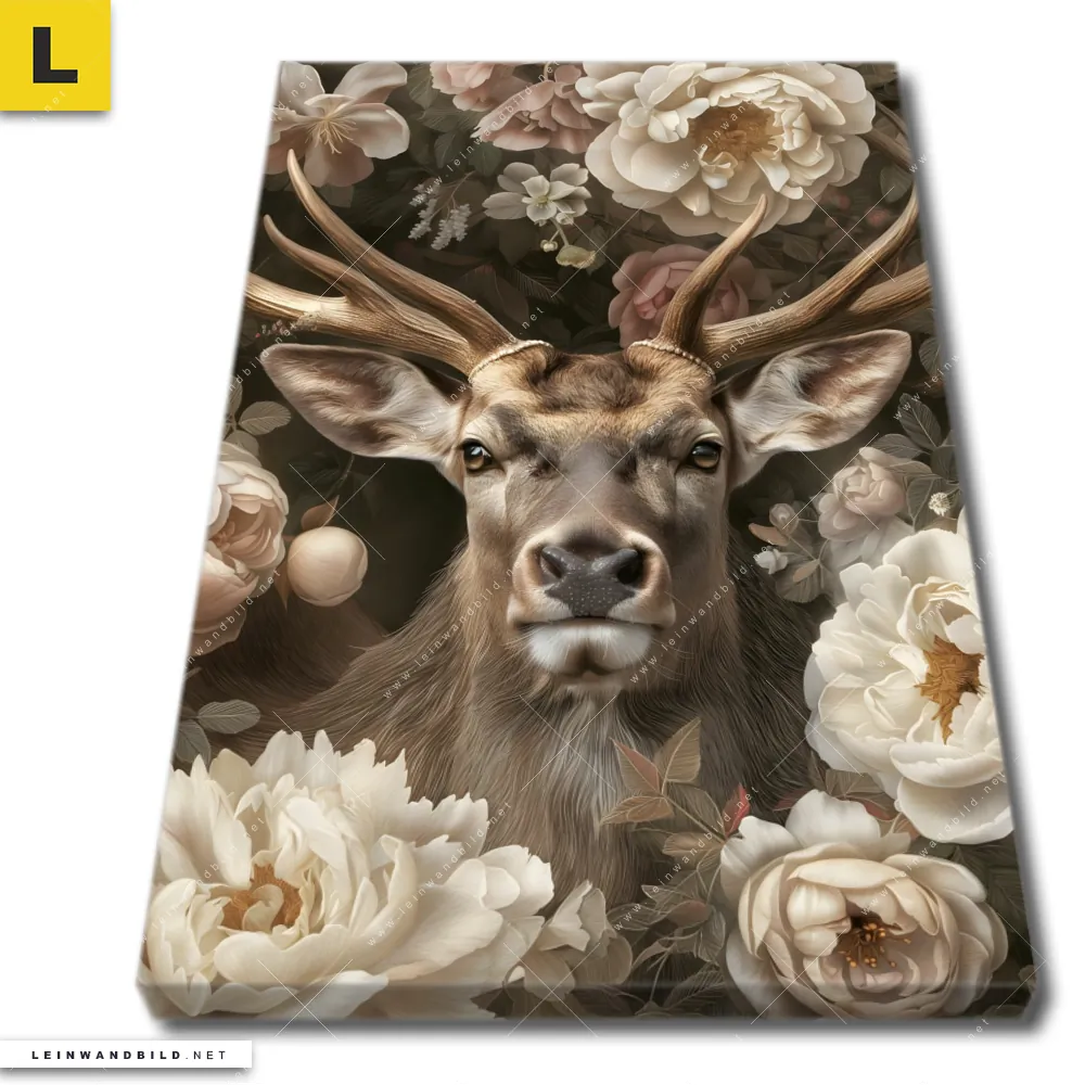 Du konfigurierst Dein individuelles Leinwandbild | Romantischer Hirsch mit Blumen | Hochformat und wir produzieren es NEU für Dich. Unsere Tierwelt, Blumen - Botanik Leinwände sind KEINE Lagerware. Du bist Dir unsicher, welches Motiv oder Format das richtige für dein individuelles Keilrahmenbild ist, dann helfen wir dir gerne weiter und beraten dich!