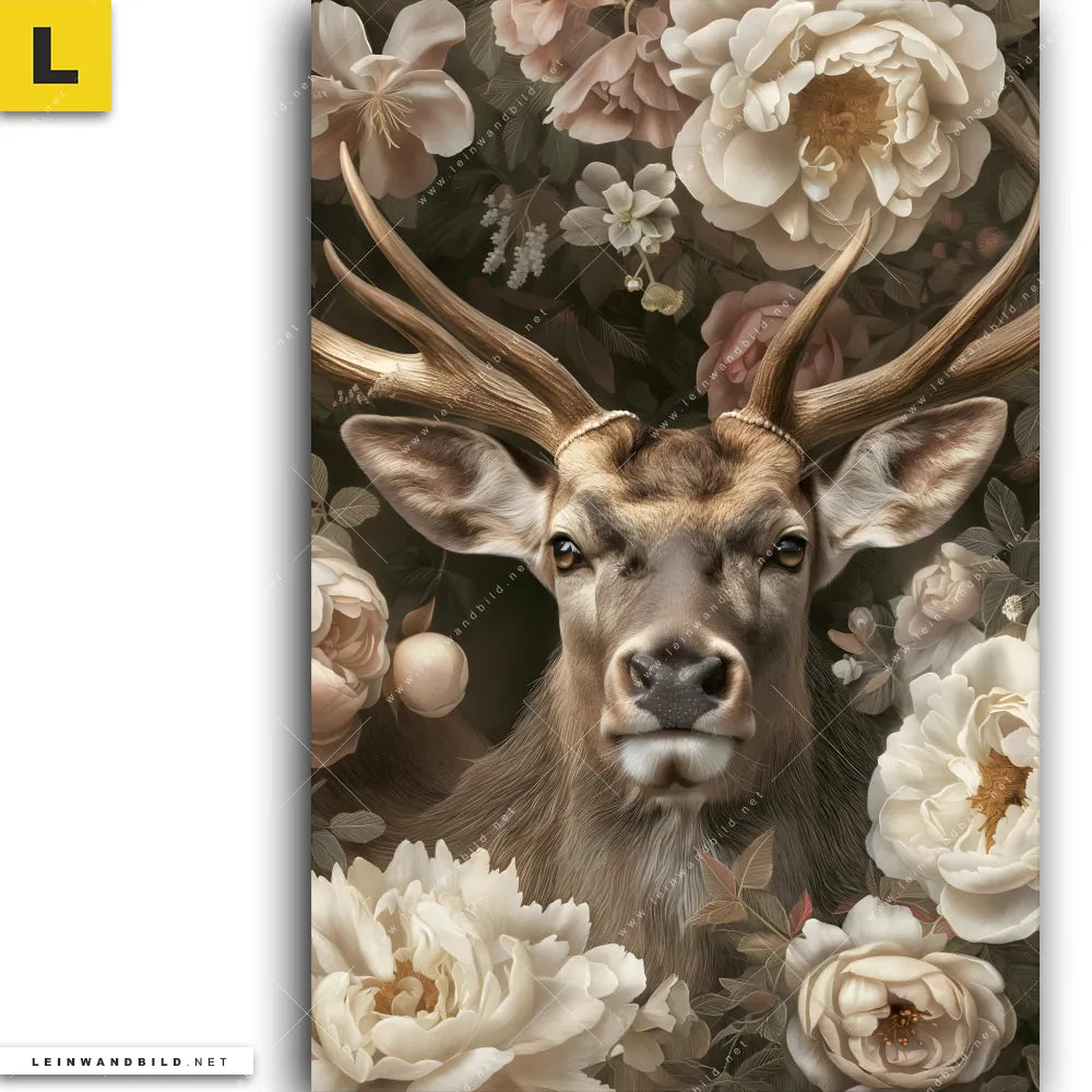Leinwandbild | Romantischer Hirsch mit Blumen | Hochformat