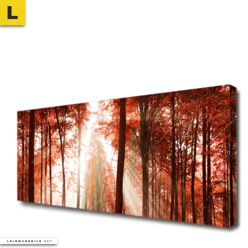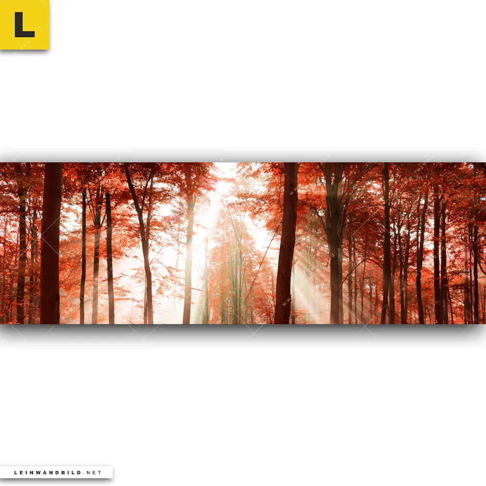 Dann sollte das Leinwandbild | Roter Herbstwald | Panorama den Weg zu Dir finden. Die moderne Fotoleinwand Farbenprächtiger Wald im Herbst fügt sich als Eye-Catcher harmonisch in jedes Arzt - Praxis, Büro - Kanzlei, Wohnzimmer - Schlafzimmer Raumkonzept ein.