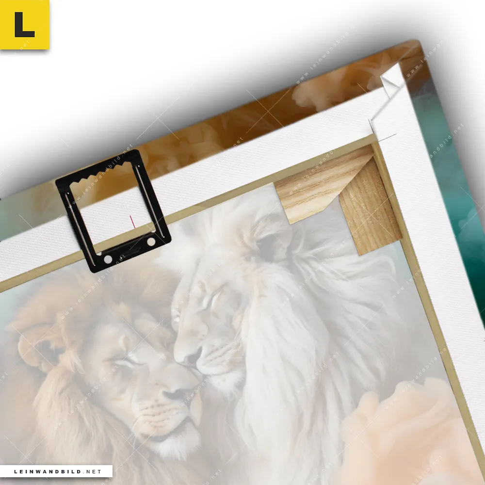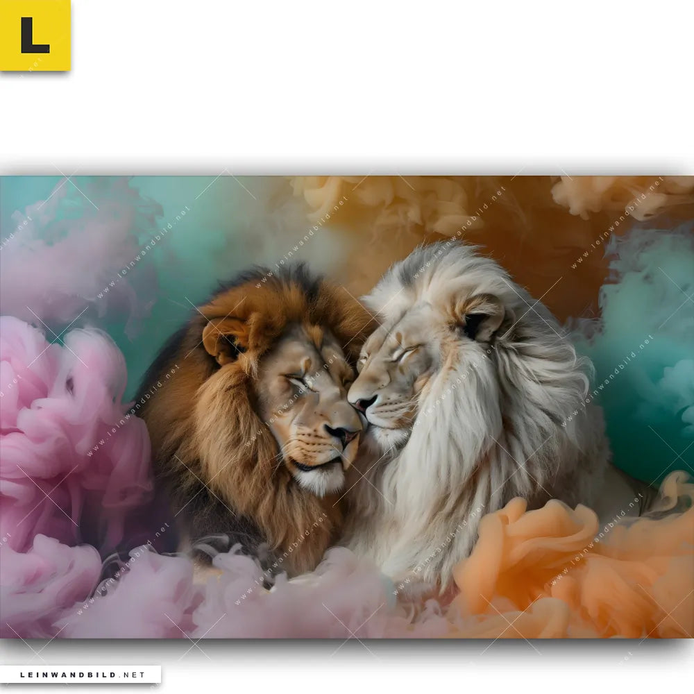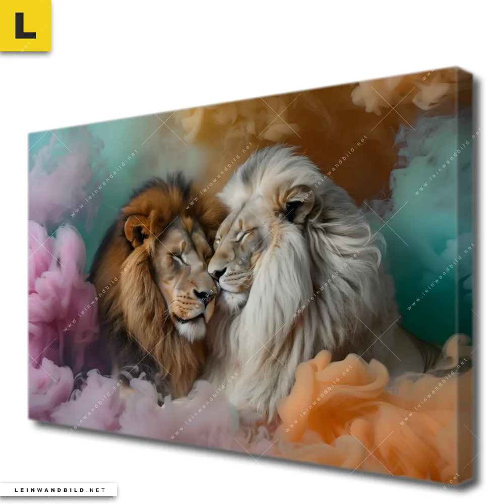 Du konfigurierst Dein individuelles Leinwandbild | Sanfte Löwenmomente in buntem Nebel | Querformat und wir produzieren es NEU für Dich. Unsere Tierwelt Leinwände sind KEINE Lagerware. Du bist Dir unsicher, welches Motiv oder Format das richtige für dein individuelles Keilrahmenbild ist, dann helfen wir dir gerne weiter und beraten dich!