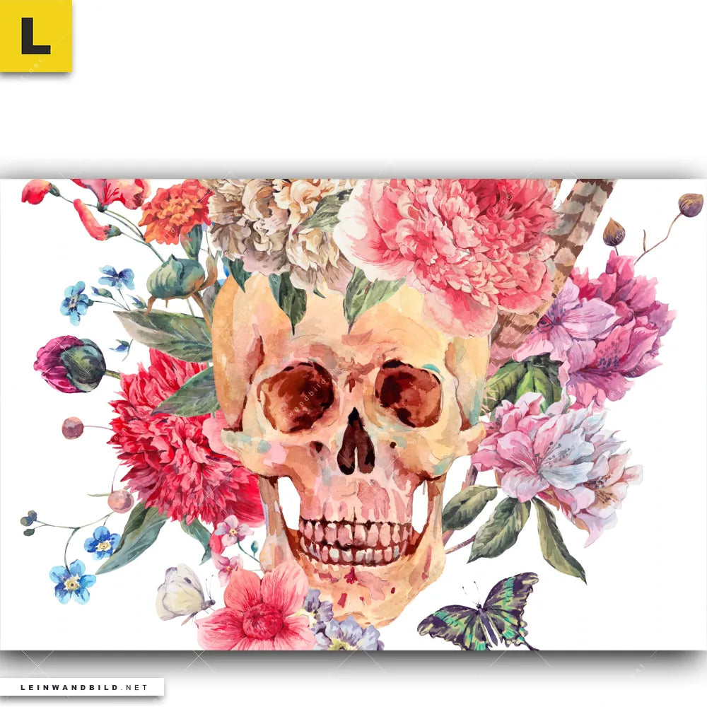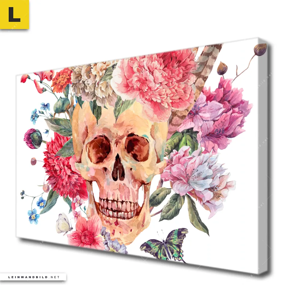 Du bist auf der Suche nach einem XXL Blumen - Botanik, Porträts - Menschen Leinwandbild und Begriffe wie Schädel, Totenkopf, Skelett, Skull, Knochen, Totenköpfe, Blumen, Blüten, Blätter, Federn, Schmetterling haben Dich auf der Suche nach Deinem neuen Querformat Wandbild auf Leinwand inspiriert? Farben wie Rot, Pink, Rosa, Weiss dürfen auf Deinem neuen breiten Keilrahmenbild nicht fehlen und Leinwände im Mixed Media, Floral Stil passen perfekt zu Deinem Einrichtungsstil?