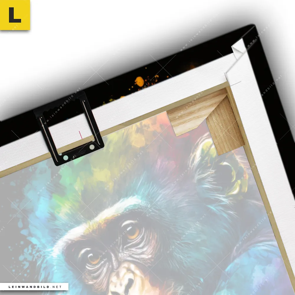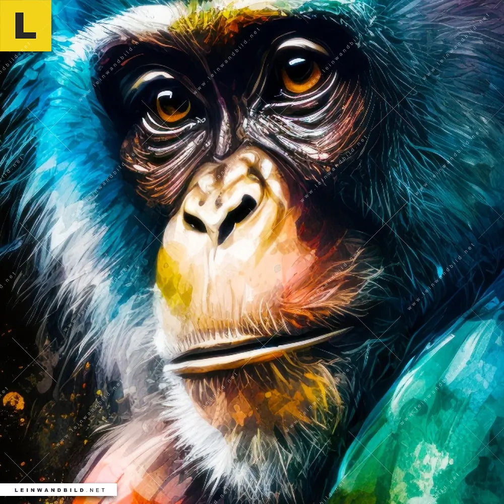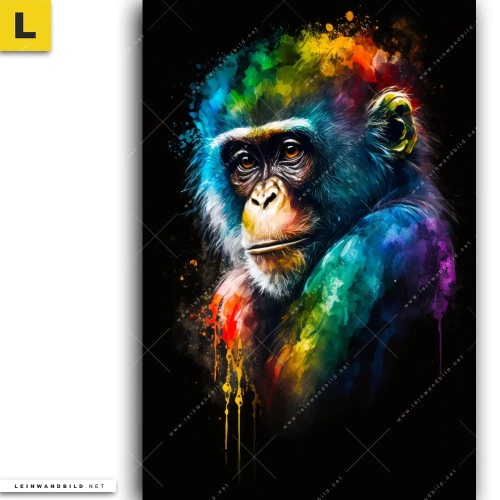Du konfigurierst Dein individuelles Leinwandbild | Schimpanse in bunten Farben | Hochformat und wir produzieren es NEU für Dich. Unsere Tierwelt Leinwände sind KEINE Lagerware. Du bist Dir unsicher, welches Motiv oder Format das richtige für dein individuelles Keilrahmenbild ist, dann helfen wir dir gerne weiter und beraten dich!