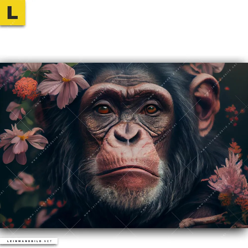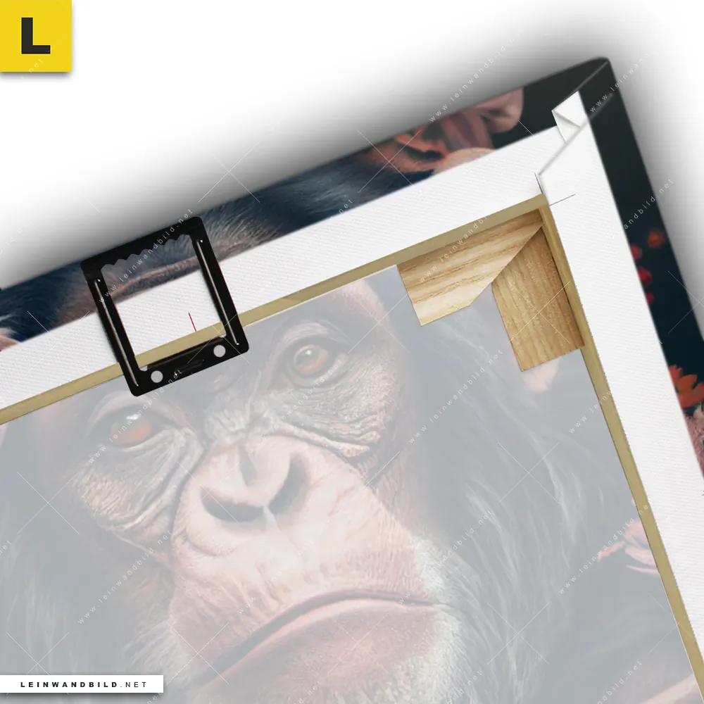 Du konfigurierst Dein individuelles Leinwandbild | Schimpanse zwischen Blumen | Querformat und wir produzieren es NEU für Dich. Unsere Tierwelt Leinwände sind KEINE Lagerware. Du bist Dir unsicher, welches Motiv oder Format das richtige für dein individuelles Keilrahmenbild ist, dann helfen wir dir gerne weiter und beraten dich!
