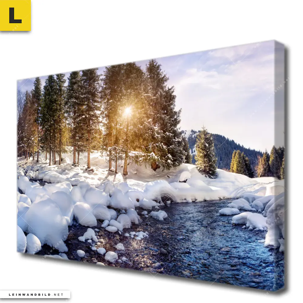 Du bist auf der Suche nach einem XXL Landschaften, Winter Leinwandbild und Begriffe wie Berge, Gebirge, Schneelandschaft, Winter, Schnee, Weihnachten, Nadelwald, Tannenbäume, Sonnenlicht, Sonne, Sonnenaufgang, Sonnenuntergang, Fluss, Bach haben Dich auf der Suche nach Deinem neuen Querformat Wandbild auf Leinwand inspiriert? Farben wie Blau, Weiss, Grün dürfen auf Deinem neuen breiten Keilrahmenbild nicht fehlen und Leinwände im Natürlich - Realistisch Stil passen perfekt zu Deinem Einrichtungsstil?