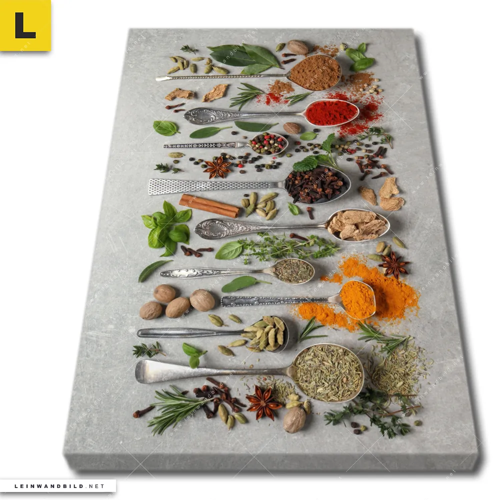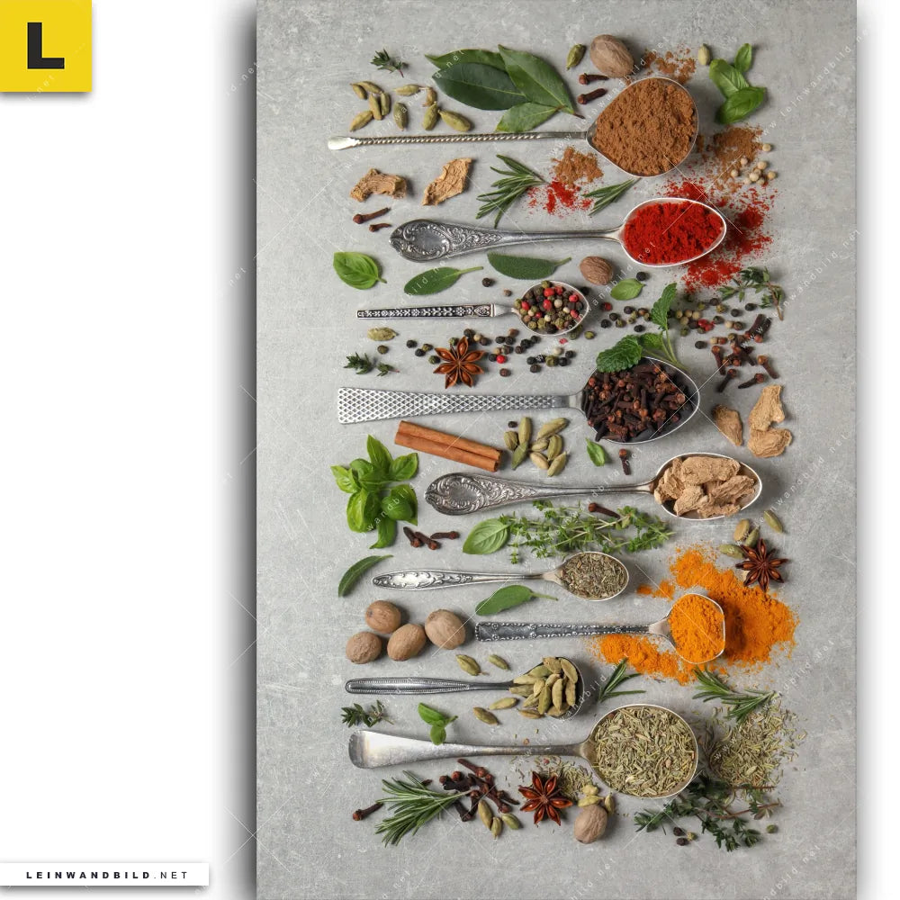Du konfigurierst Dein individuelles Leinwandbild | Silberlöffel mit Gewürzen | Hochformat und wir produzieren es NEU für Dich. Unsere Essen - Trinken Leinwände sind KEINE Lagerware. Du bist Dir unsicher, welches Motiv oder Format das richtige für dein individuelles Keilrahmenbild ist, dann helfen wir dir gerne weiter und beraten dich!