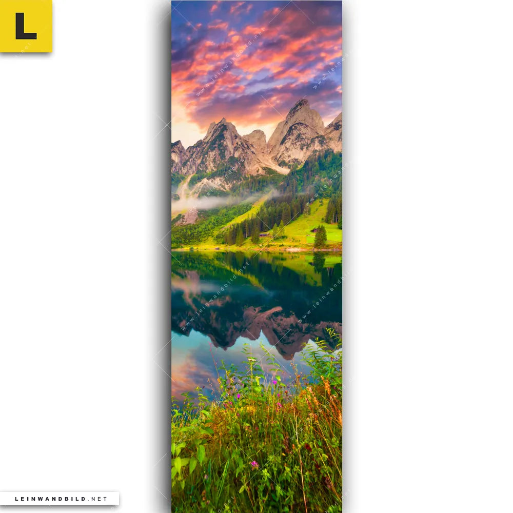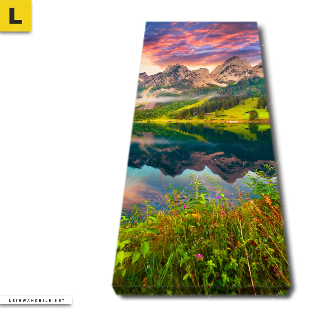 Du konfigurierst Dein individuelles Leinwandbild | Sonnenaufgang am Bergsee | Schmal und wir produzieren es NEU für Dich. Unsere Landschaften Leinwände sind KEINE Lagerware. Du bist Dir unsicher, welches Motiv oder Format das richtige für dein individuelles Keilrahmenbild ist, dann helfen wir dir gerne weiter und beraten dich!
