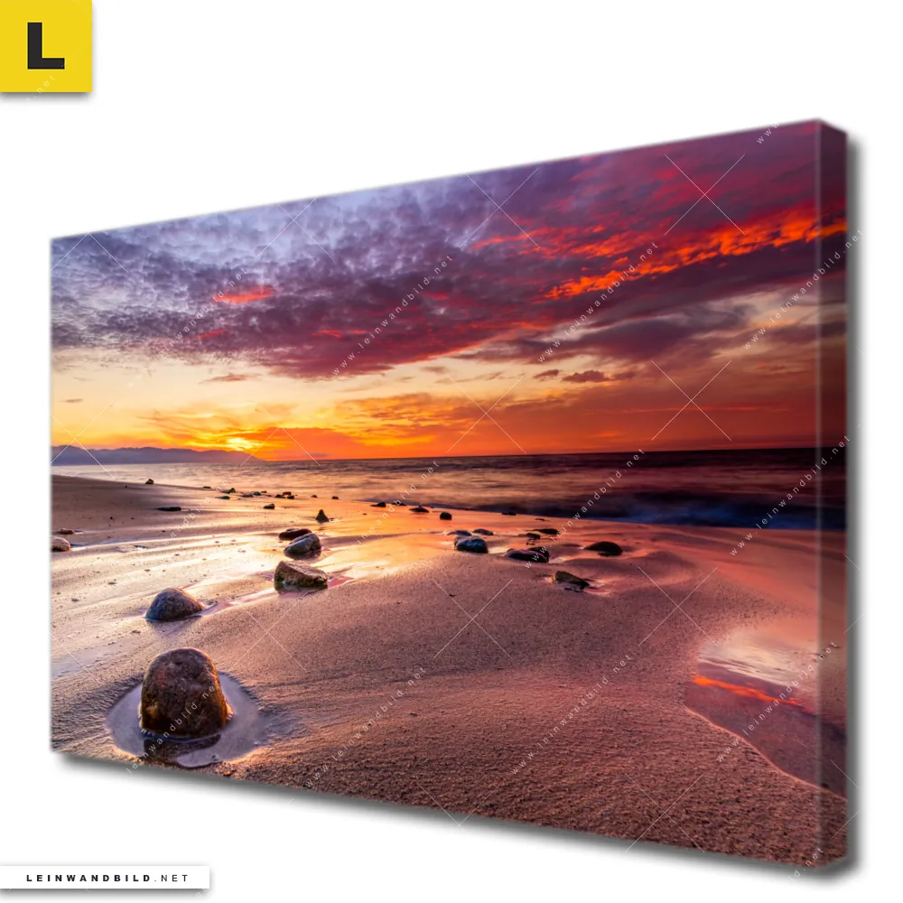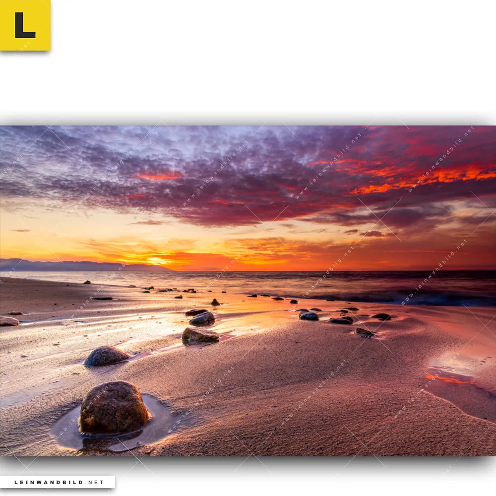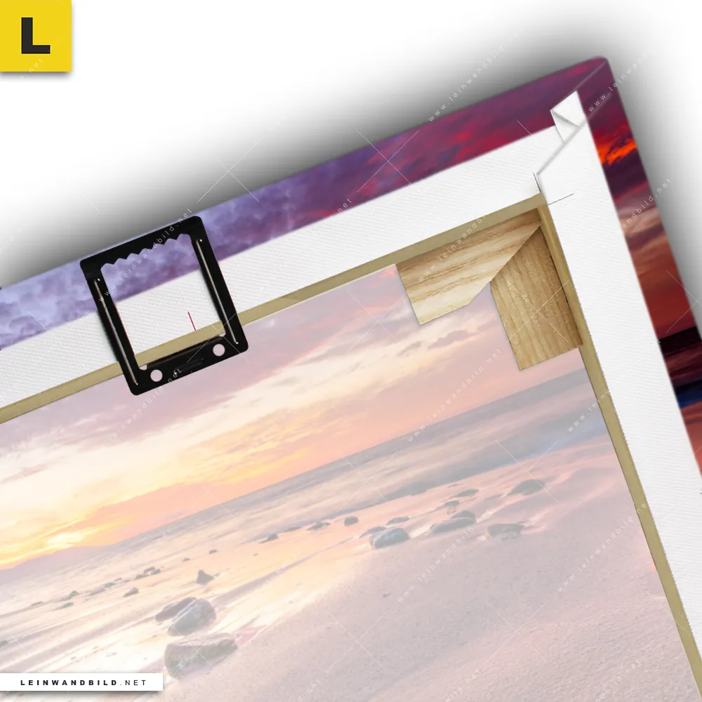 Du konfigurierst Dein individuelles Leinwandbild | Sonnenuntergang am Strand mit Felsen | Querformat und wir produzieren es NEU für Dich. Unsere Landschaften, Strand - Meer Leinwände sind KEINE Lagerware. Du bist Dir unsicher, welches Motiv oder Format das richtige für dein individuelles Keilrahmenbild ist, dann helfen wir dir gerne weiter und beraten dich!