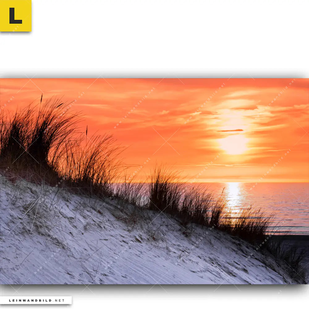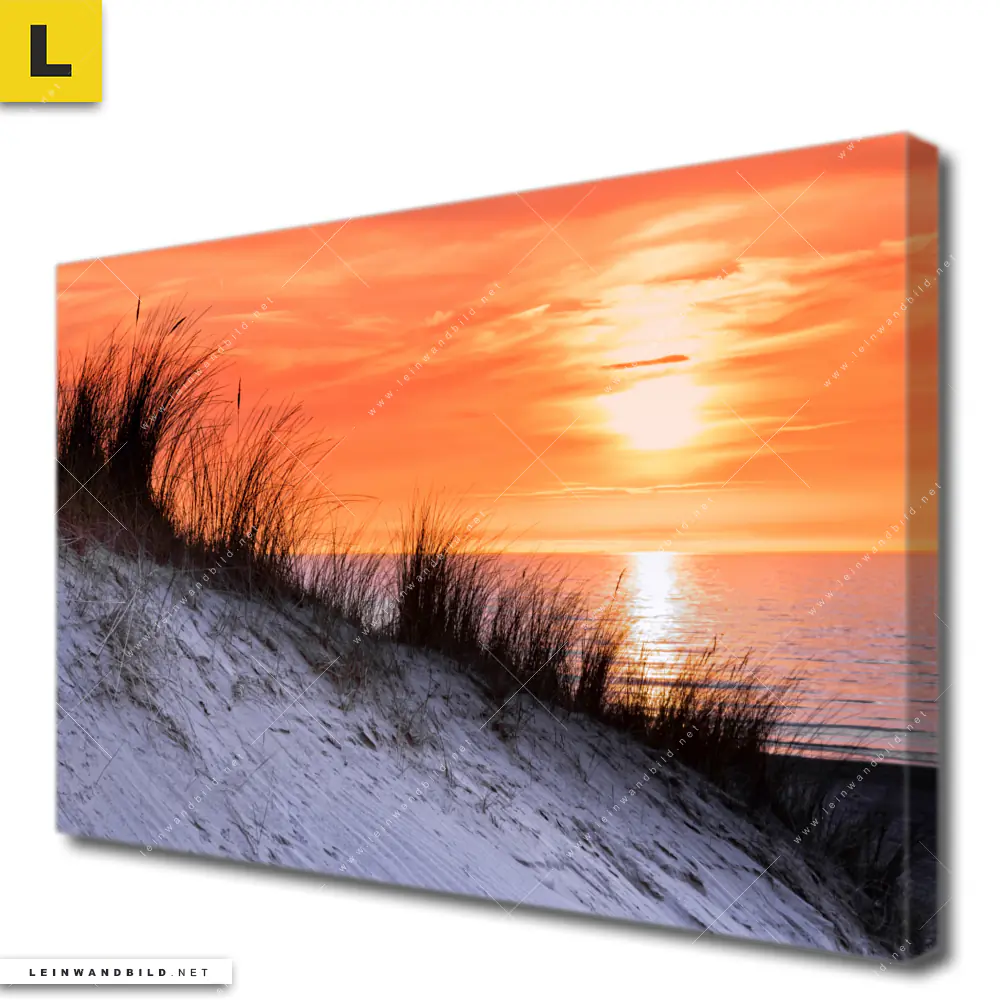 Dann sollte das Leinwandbild | Sonnenuntergang mit Düne und Meer | Querformat den Weg zu Dir finden. Die moderne Fotoleinwand Küstenlandschaft mit Sonnenuntergang fügt sich als Eye-Catcher harmonisch in jedes Arzt - Praxis, Wohnzimmer - Schlafzimmer, Badezimmer, Flur - Eingangsbereich Raumkonzept ein.