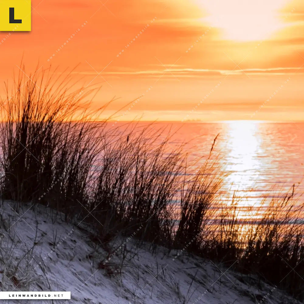 Begriffe wie Sommer, Deutschland, Sonnenuntergang, Sonnenaufgang, Bucht, Meer, Urlaub, Reisen, Nordsee, Ostsee, Dünen, Gräser haben Dich auf der Suche nach Deinem neuen Wandbild auf Leinwand inspiriert? Dann sollte das Leinwandbild Strandidylle bei Sonnenuntergang den Weg zu Dir finden.