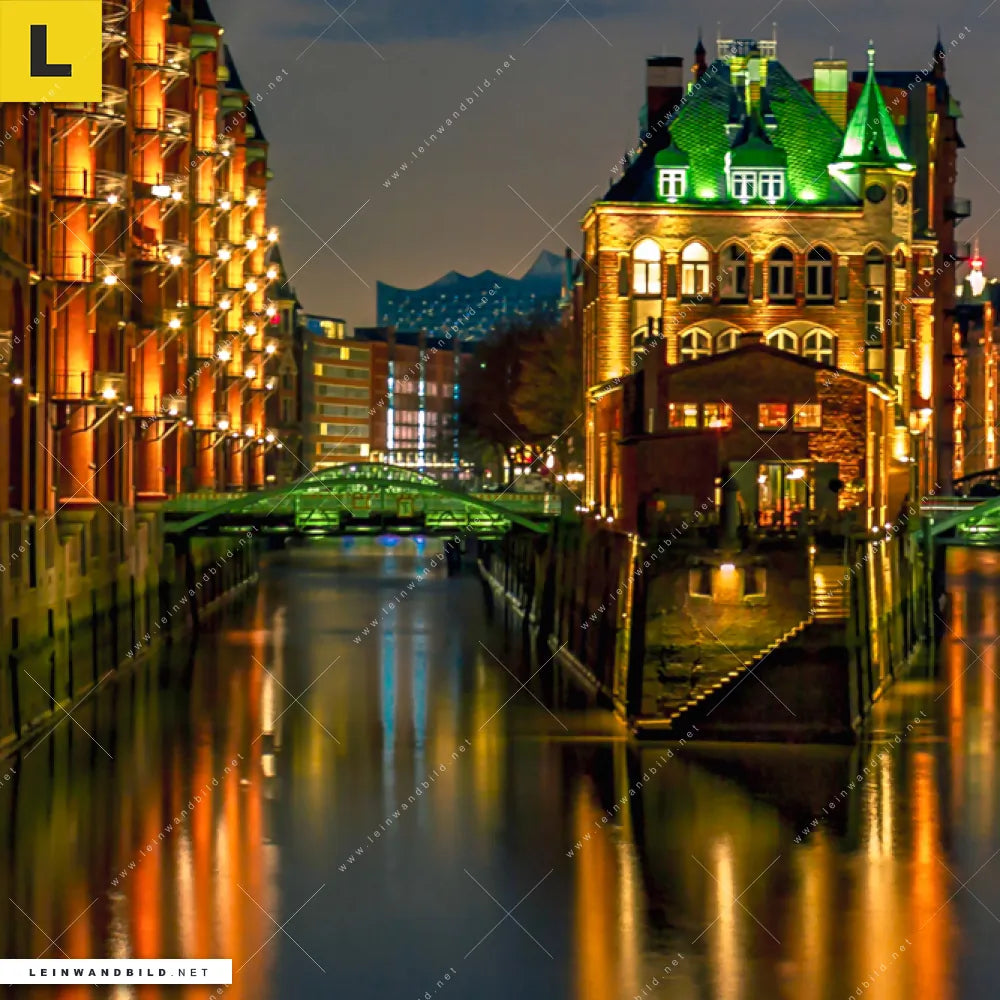 Dann sollte das Leinwandbild | Speicherstadt Hamburg | Hochformat den Weg zu Dir finden. Die moderne Fotoleinwand Hamburg am Abend fügt sich als Eye-Catcher harmonisch in jedes Arzt - Praxis, Bar - Gastronomie, Büro - Kanzlei, Flur - Eingangsbereich, Wohnzimmer - Schlafzimmer Raumkonzept ein.