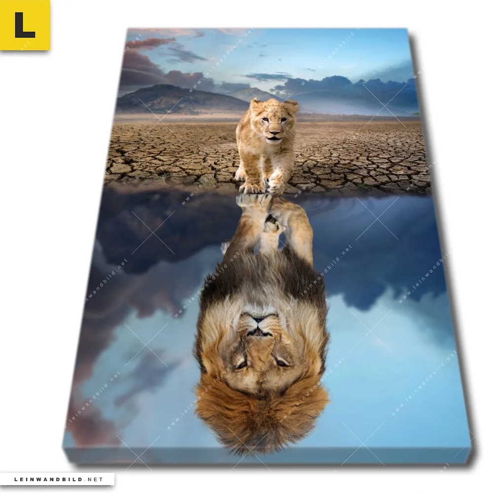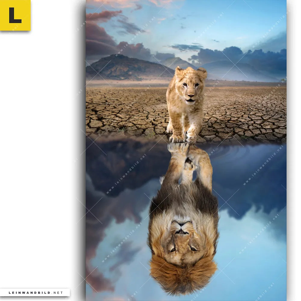 Dann sollte das Leinwandbild | Spiegelbild Löwe & Löwenjunges | Hochformat den Weg zu Dir finden. Die moderne Fotoleinwand Glaube an sich selbst fügt sich als Eye-Catcher harmonisch in jedes Arzt - Praxis, Bar - Gastronomie, Büro - Kanzlei, Flur - Eingangsbereich, Kinderzimmer, Wohnzimmer - Schlafzimmer Raumkonzept ein.