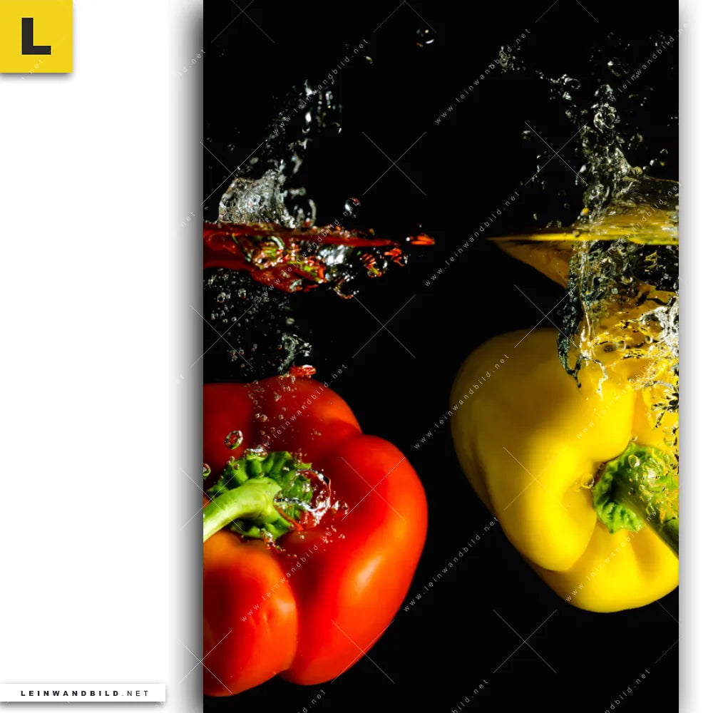 Du konfigurierst Dein individuelles Leinwandbild | Spritzer von Paprika beim fallen ins Wasser | Hochformat und wir produzieren es NEU für Dich. Unsere Essen - Trinken Leinwände sind KEINE Lagerware. Du bist Dir unsicher, welches Motiv oder Format das richtige für dein individuelles Keilrahmenbild ist, dann helfen wir dir gerne weiter und beraten dich!