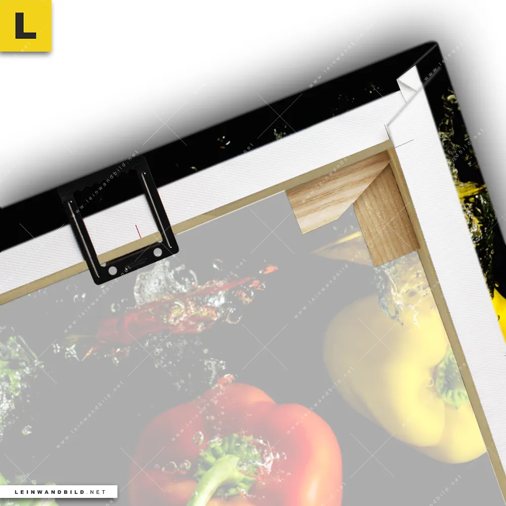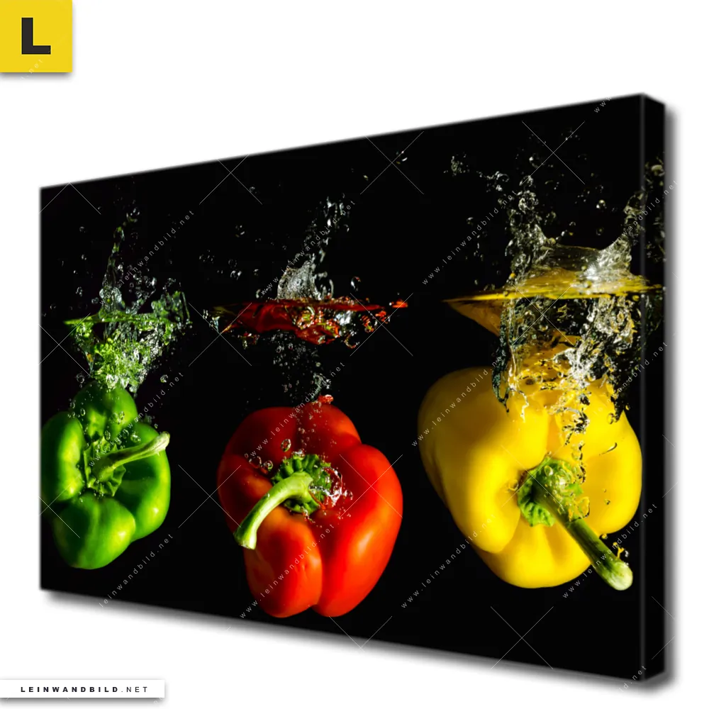 Du konfigurierst Dein individuelles Leinwandbild | Spritzer von Paprika beim fallen ins Wasser | Querformat und wir produzieren es NEU für Dich. Unsere Essen - Trinken Leinwände sind KEINE Lagerware. Du bist Dir unsicher, welches Motiv oder Format das richtige für dein individuelles Keilrahmenbild ist, dann helfen wir dir gerne weiter und beraten dich!