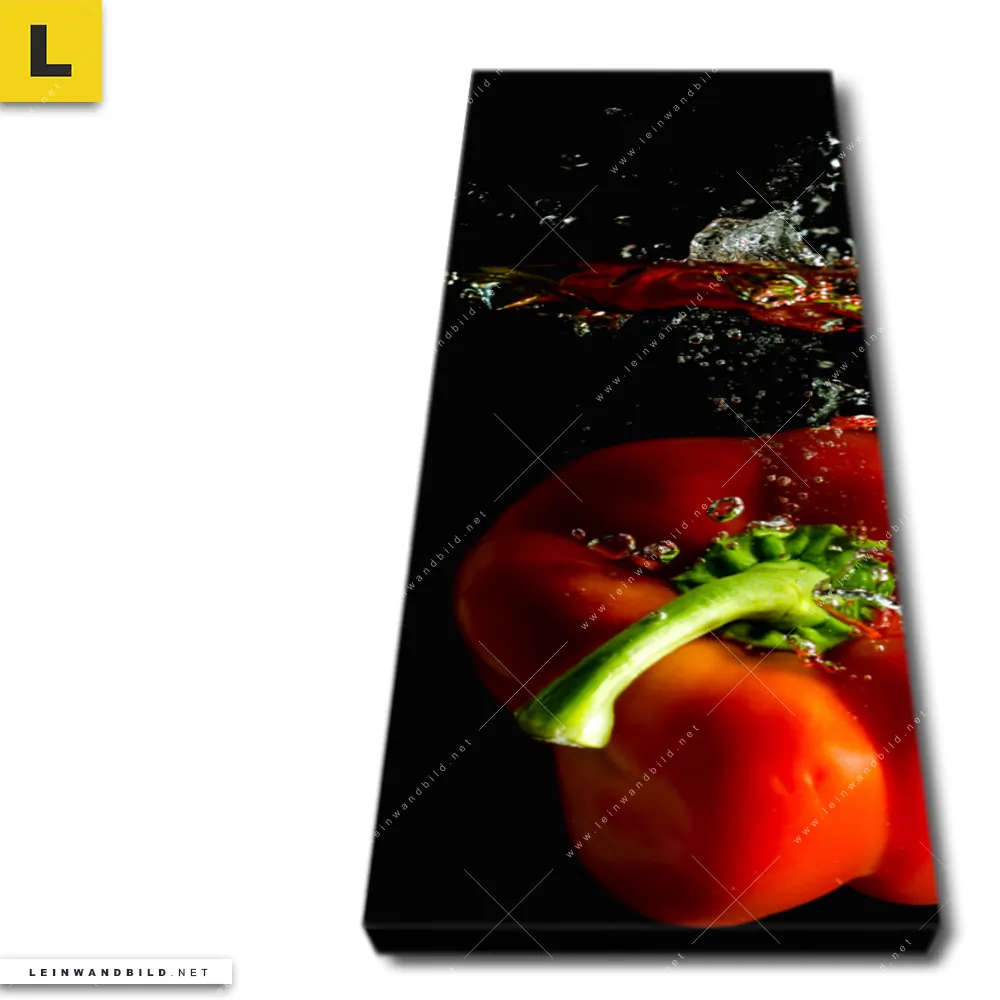 Du konfigurierst Dein individuelles Leinwandbild | Spritzer von Paprika beim fallen ins Wasser | Schmal und wir produzieren es NEU für Dich. Unsere Essen - Trinken Leinwände sind KEINE Lagerware. Du bist Dir unsicher, welches Motiv oder Format das richtige für dein individuelles Keilrahmenbild ist, dann helfen wir dir gerne weiter und beraten dich!
