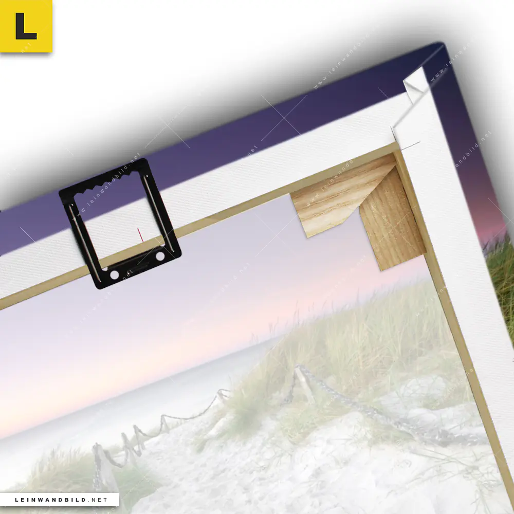 Das Leinwandbild | Strandweg im Sonnenuntergang | Querformat wird auf 260 g/m² Polyester-Stretch-Canvas gedruckt und überzeugt in den Farben Lila, Orange, Beige, Grün mit hoher Farbintensität, Farbsättigung und langer Farb-Echtheit. Bei der Herstellung unserer Landschaften, Strand - Meer Leinwandbilder im Querformat achten wir stets auf hochwertige Qualität, sowohl im Verarbeitungsprozess als auch bei den Materialien. Die Leinwand mit dem Motiv Abendstimmung am Meer im Querformat wird fix und fertig, auf einem 2cm starken Holzkeilrahmen aufgespannt, geliefert. Vom Druck über den Rahmenbau bis zum Bespannen des Leinwandbildes Dünenpfad zum Strand mit Weg, Pier, Deutschland, Sommer, Frühling, Ostsee, Nordsee, Sonnenuntergang, Sonnenaufgang, Natur, Urlaub, Reisen, Meer, Strand gestaltet als Fotografie wird bei uns alles in verantwortungsvoller Handarbeit gefertigt.