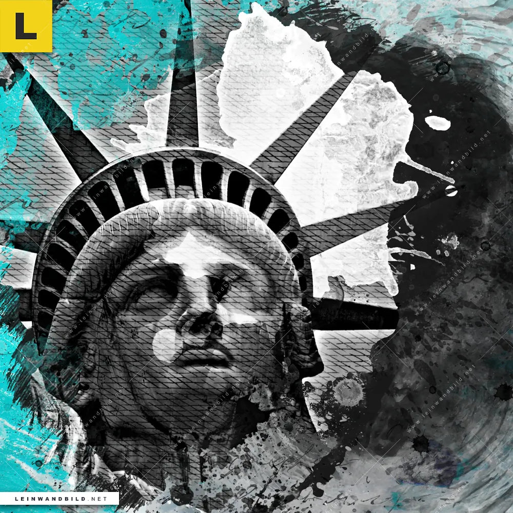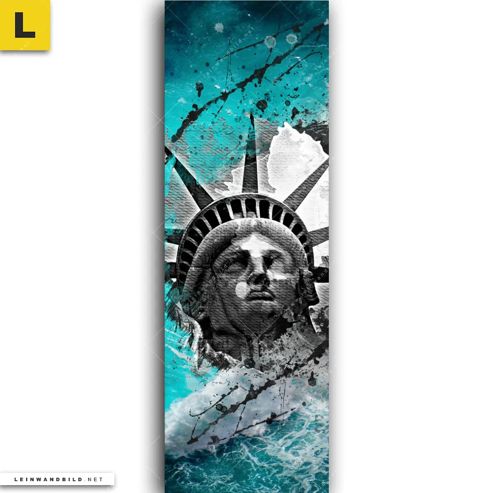 Du bist auf der Suche nach einem XXL Städte - Skylines, Strand - Meer Leinwandbild und Begriffe wie Grunge, Streetart, modern, Freiheitsstatue, Statue of Liberty, Amerika, USA, Meer, Ozean, Wellen haben Dich auf der Suche nach Deinem neuen Schmalen Wandbild auf Leinwand inspiriert? Farben wie Türkis, Grau , Schwarz dürfen auf Deinem neuen Keilrahmenbild im Panorama-Hochformat nicht fehlen und Leinwände im Abstrakt, Grunge, Mixed Media, Modern Art Stil passen perfekt zu Deinem Einrichtungsstil?