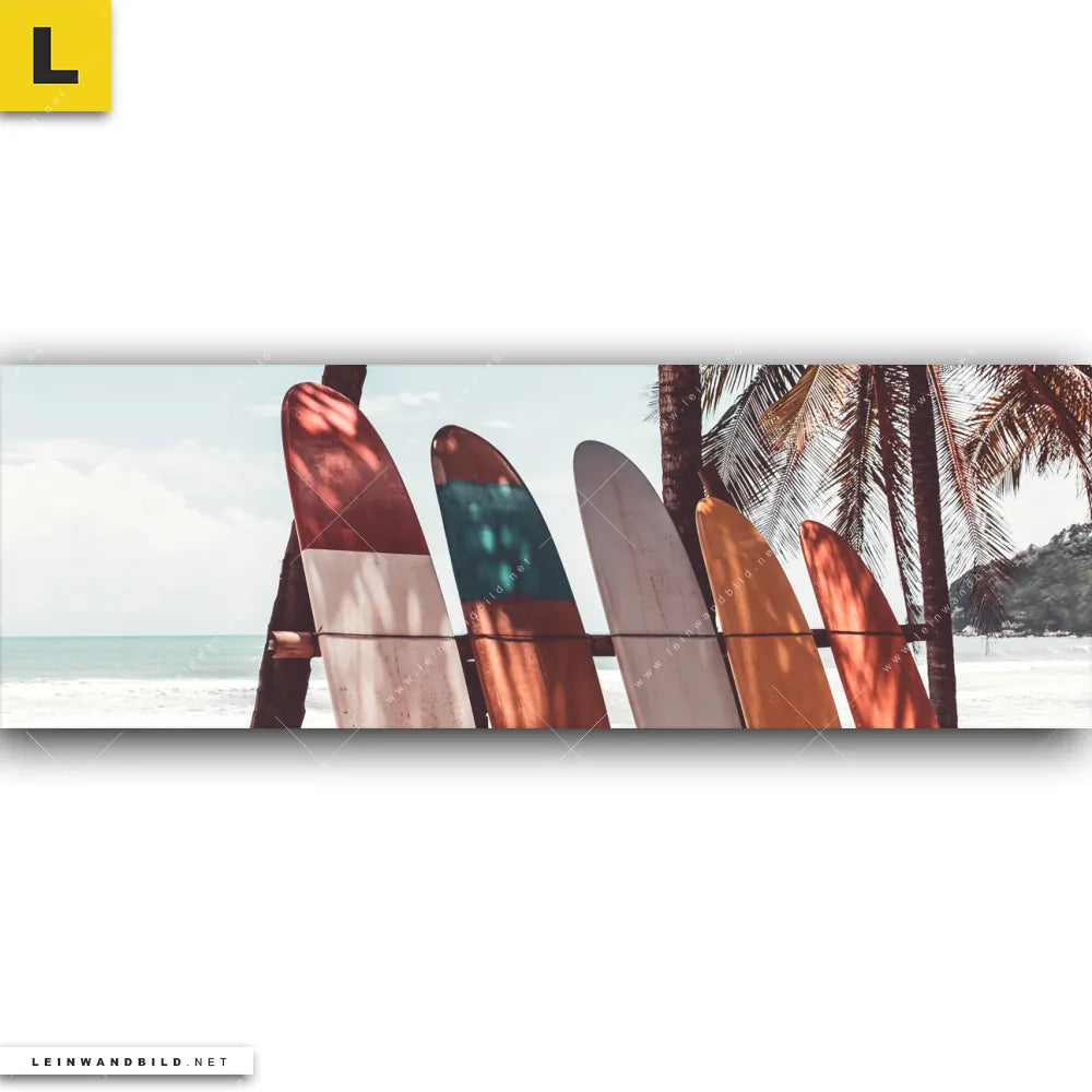 Du konfigurierst Dein individuelles Leinwandbild | Surfbretter und Palmen | Panorama und wir produzieren es NEU für Dich. Unsere Strand - Meer Leinwände sind KEINE Lagerware. Du bist Dir unsicher, welches Motiv oder Format das richtige für dein individuelles Keilrahmenbild ist, dann helfen wir dir gerne weiter und beraten dich!