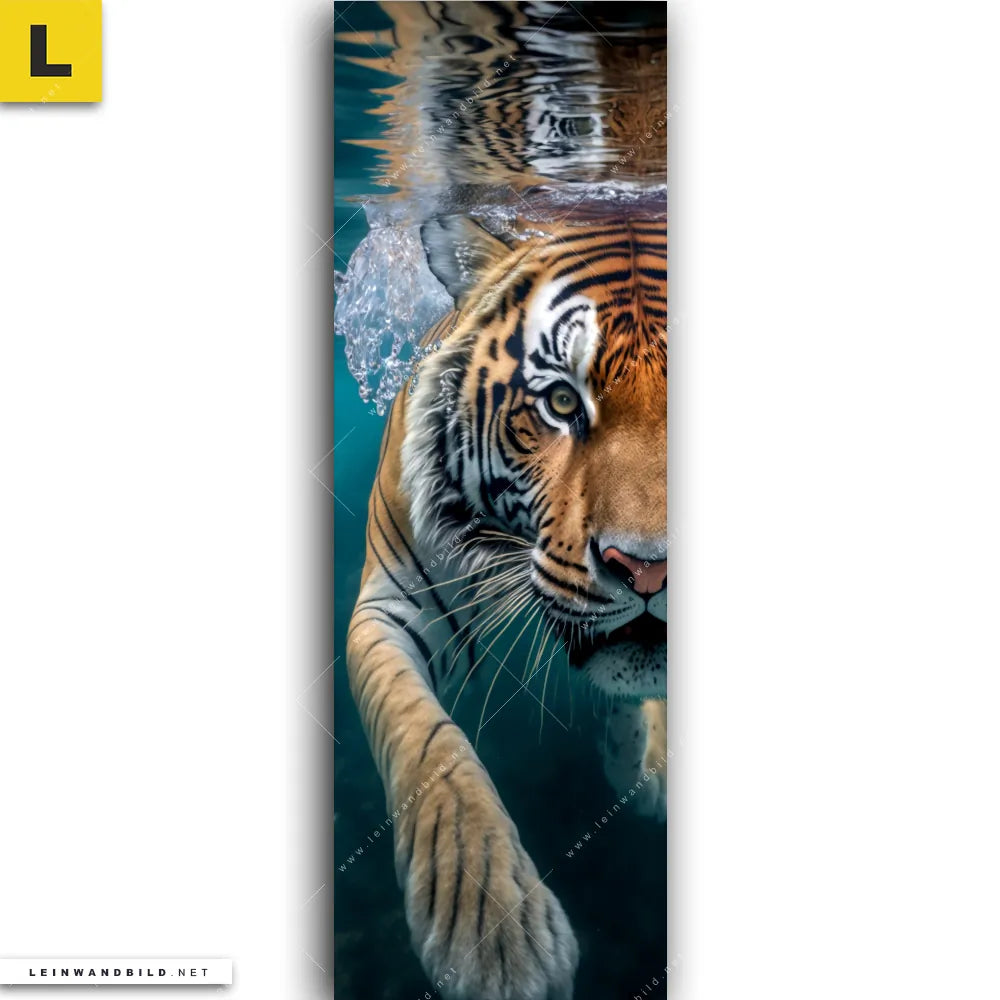 Du konfigurierst Dein individuelles Leinwandbild | Tauchender Tiger | Schmal und wir produzieren es NEU für Dich. Unsere Tierwelt Leinwände sind KEINE Lagerware. Du bist Dir unsicher, welches Motiv oder Format das richtige für dein individuelles Keilrahmenbild ist, dann helfen wir dir gerne weiter und beraten dich!