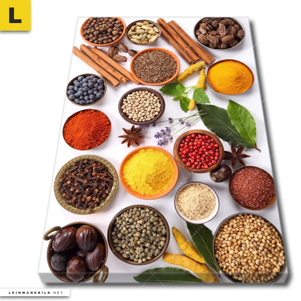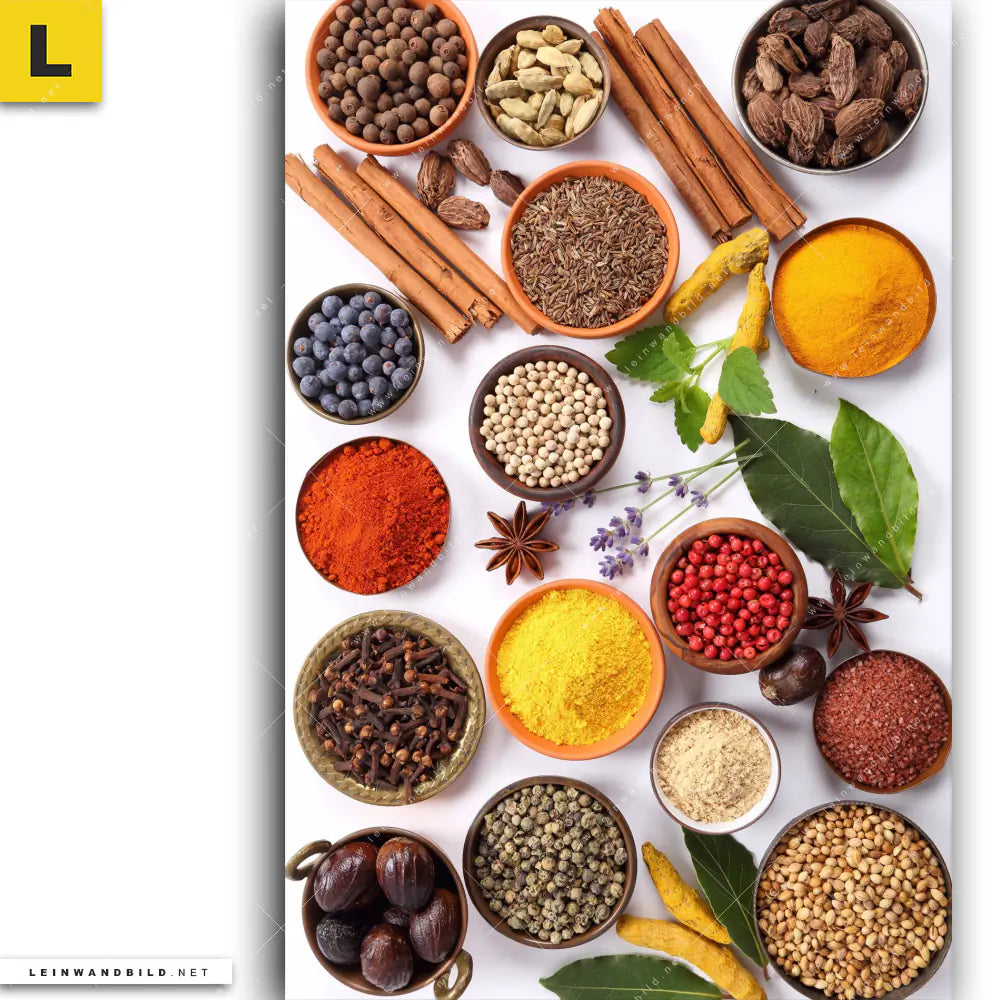 Du konfigurierst Dein individuelles Leinwandbild | Vielfältige Gewürze | Hochformat und wir produzieren es NEU für Dich. Unsere Essen - Trinken Leinwände sind KEINE Lagerware. Du bist Dir unsicher, welches Motiv oder Format das richtige für dein individuelles Keilrahmenbild ist, dann helfen wir dir gerne weiter und beraten dich!