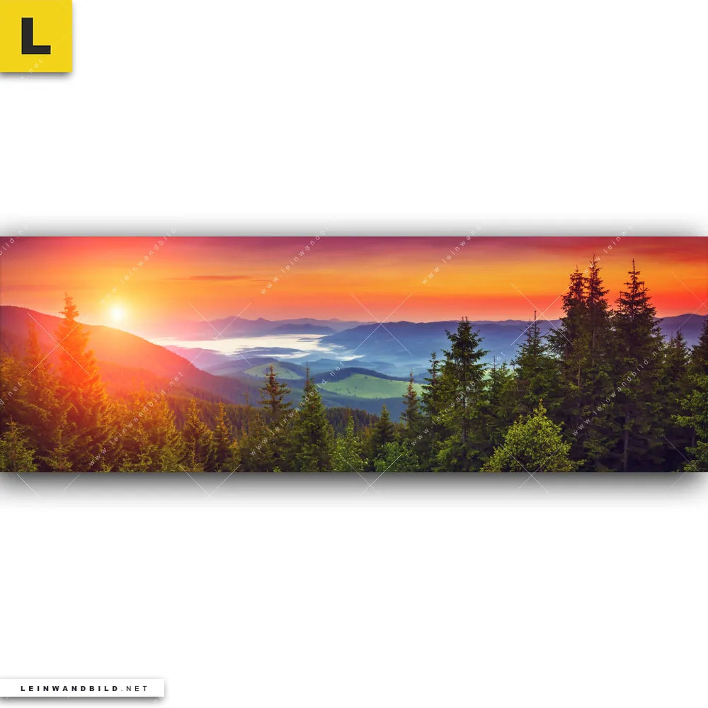 Du konfigurierst Dein individuelles Leinwandbild | Wald bei Sonnenuntergang | Panorama und wir produzieren es NEU für Dich. Unsere Landschaften, Wald - Bäume Leinwände sind KEINE Lagerware. Du bist Dir unsicher, welches Motiv oder Format das richtige für dein individuelles Keilrahmenbild ist, dann helfen wir dir gerne weiter und beraten dich!