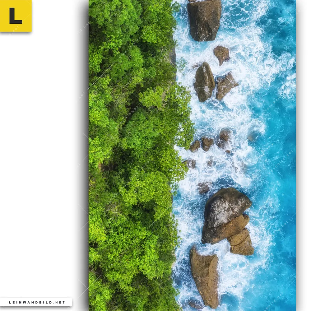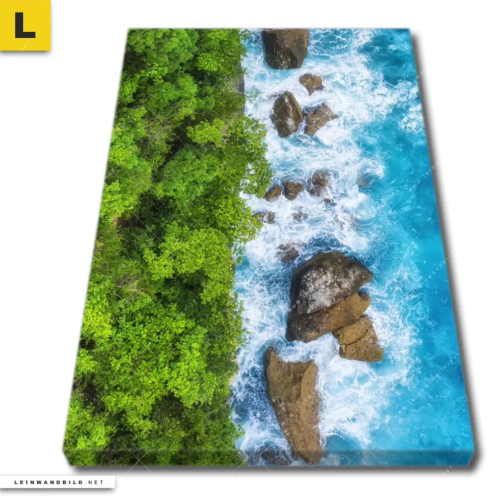 Du bist auf der Suche nach einem XXL Landschaften, Wald - Bäume, Strand - Meer Leinwandbild und Begriffe wie Wald, Landschaft, Baum, Bäume, Natur, Nadelwald, Laubwald, Meer, Wellen, Felsen, Vogelperspektive, Insel haben Dich auf der Suche nach Deinem neuen Hochformat Wandbild auf Leinwand inspiriert? Farben wie Grün, Blau, Braun, Türkis dürfen auf Deinem neuen vertikalen Keilrahmenbild nicht fehlen und Leinwände im Natürlich - Realistisch Stil passen perfekt zu Deinem Einrichtungsstil?